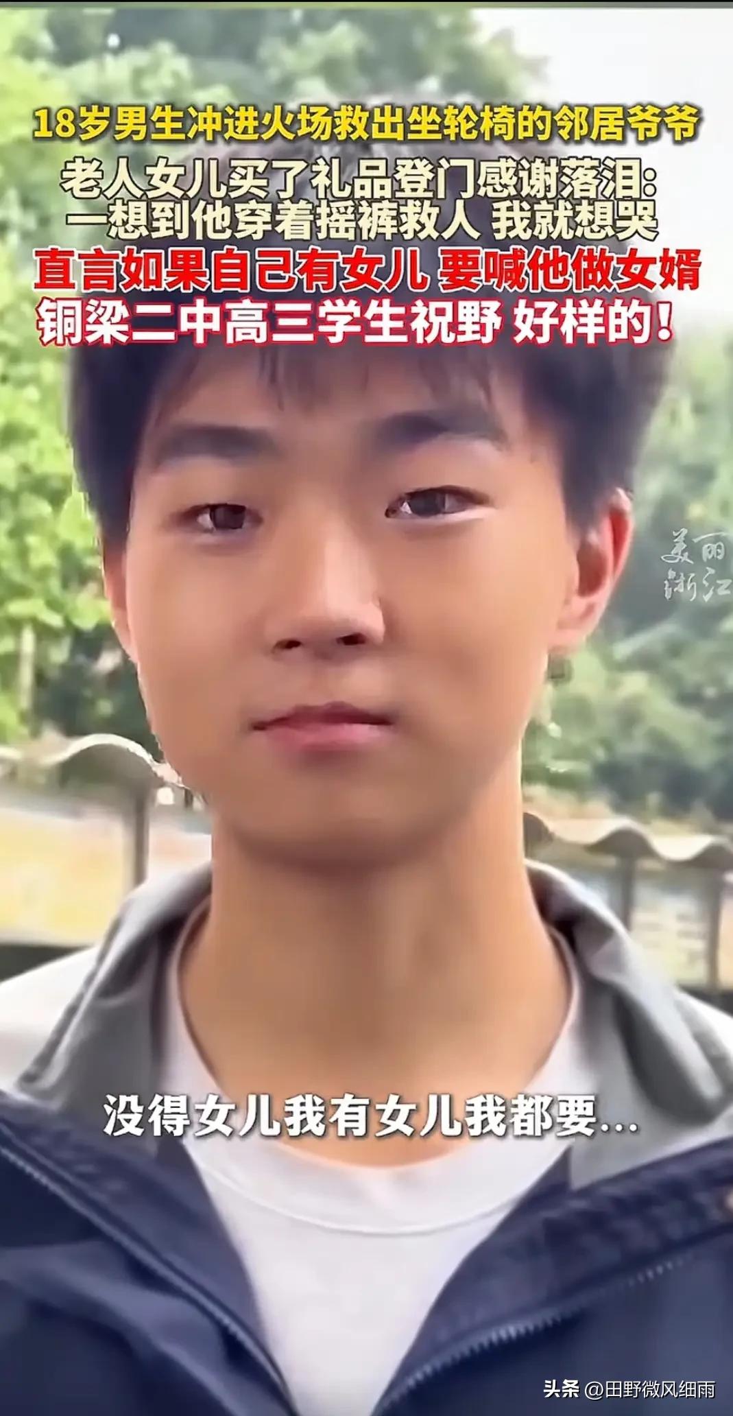 少年无畏,善举如光 2025年10月29日,重庆铜梁区18岁高三学生祝野的英勇事迹,如同一束强光,照亮了人们的心灵。在邻居家突发火灾、火势凶猛的危急时刻,他仅穿内裤、赤脚冲进火场,成功救出被困的八旬老人,这份勇敢与担当令人动容。 祝野的行为展现出了超越年龄的果敢与善良。在危险面前,他没有丝毫犹豫,心中只有救人的信念。尽管手部被火焰轻微灼伤,全程赤脚,但这些都无法阻挡他奔向被困老人的脚步。他用实际行动诠释了什么是无私奉献,什么是在关键时刻挺身而出的英雄气概。 邻居家因电动轮椅车充电起火,两位老人被困其中,情况万分危急。祝野的出现,无疑是黑暗中的一道曙光,避免了一场悲剧的发生。他的善举不仅拯救了两条生命,也让我们看到了人性的光辉。 被救老人的女儿江女士多次公开致谢,甚至表示“如果我有女儿,一定让他当女婿”,并到学校表达感激之情,这是对祝野善举的高度认可。而学校班主任透露,祝野平时训练刻苦,在校乐于助人,此次救人行为正是他一贯善良品质的体现。 多家媒体对这一事件的报道,让更多人了解到祝野的英勇事迹。他的故事激励着我们每一个人,在生活中要保持善良和勇敢,在他人遇到困难时,伸出援手,传递温暖。祝野是新时代的好少年,他的精神值得我们学习和弘扬,相信他的善举会影响更多人,让社会充满爱与希望。学生救人事迹 少年救火英雄 十九岁男孩救人