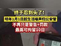 终于忍到头了!明年1月1日起噪音扰民最高可拘留10日】10月27日(报道),据