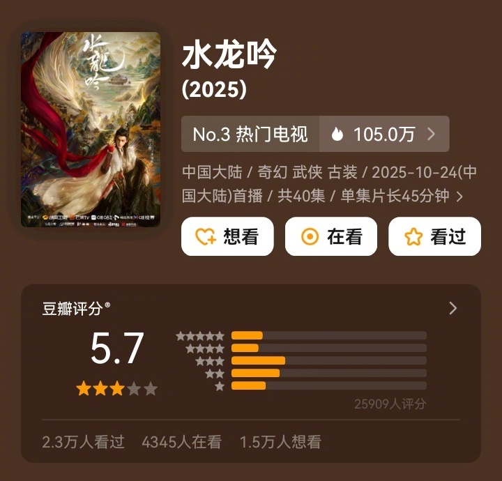 罗云熙《水龙吟》开分5.7分,2.5w人评