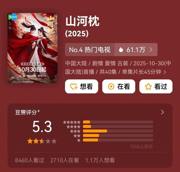 宋茜《山河枕》开分5.3分,7.2k人评 ​​​