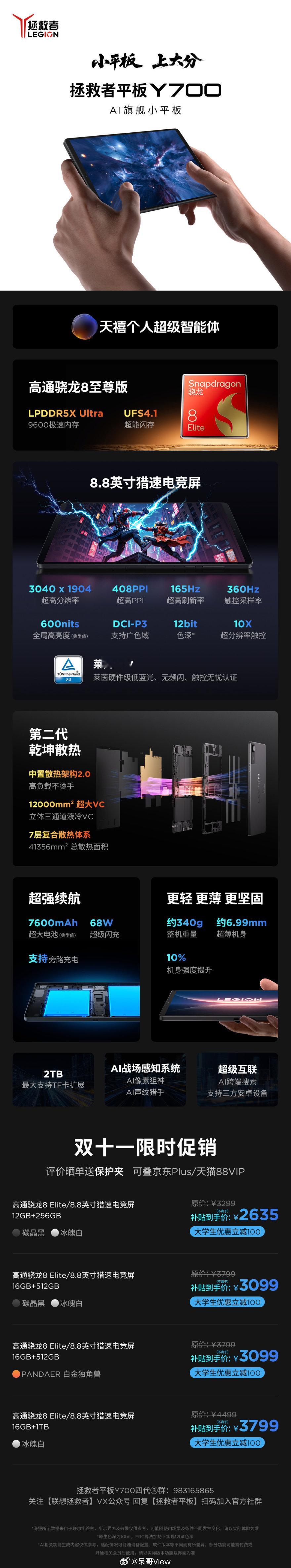 消息称联想拯救者Y700小平板2026款或将搭载骁龙8EliteGen5处理