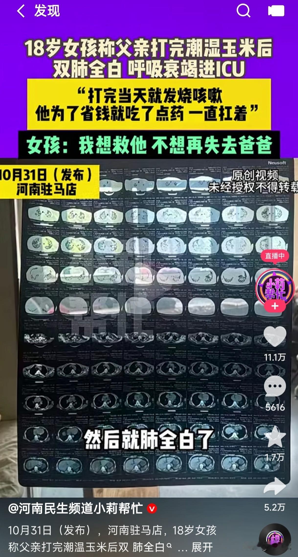 河南驻马店18岁女孩称父亲打完潮湿玉米后双肺全白,呼吸衰竭进ICU.这是被潮湿发霉的玉米中毒导致还是他这个病时间久了突然发作了? 对于种过粮食的人来说,粮食潮湿发霉后,那种刺鼻的味道真的很难闻,尤其是潮湿发霉的玉米,在用机器打的过程中,空气中都弥漫着一股发霉的味,不知这女孩的父亲是被发霉的玉米中毒了?还是他这个病时间久了,只是在干活的时候突然之间发作了? 希望他能挺过去吧,他是家里的顶梁柱,更是孩子的后盾和希望,愿他战胜病魔,早日康复。