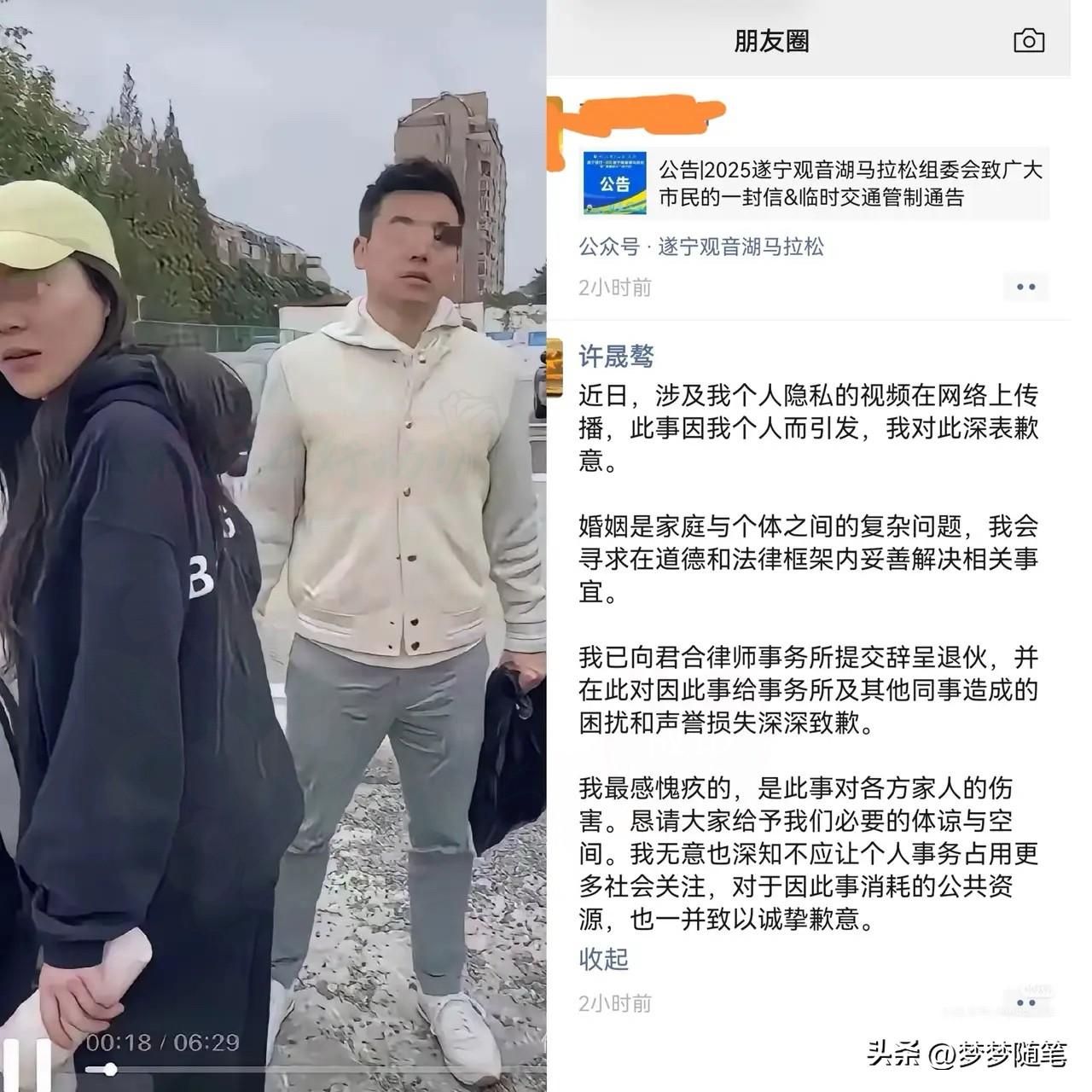 许律师带三产检的后续来了。 他在朋友圈发了一篇小作文,回应了这次的丑闻。 首先,他道歉了。占用公共资源,深表歉意。 对各方家人感到愧疚。 然后他已经向律所提交了辞呈退伙。 带第三者产检被抓现行,道歉只字不提出轨过错,反倒强调“占用公共资源”,这避重就轻的本事也是没谁了。 说婚姻是“家庭与个体的复杂问题”,明摆着不想直面背叛,甚至暗戳戳想甩锅;提交辞呈看着像担责,实则更像为了自保脱身。 嘴上求大家别占用社会资源,潜台词不就是让网友停手、别再扒后续? 身为律师,把话术玩得这么溜,难免让人怀疑,是不是早盘算着起诉原配发视频索赔? 原配删了视频,独自扛下所有,而他倒想靠着一套漂亮话美美隐身? 最讽刺的是,懂法律、明底线的人,偏偏最先突破了道德和婚姻的红线。 你觉得原配接下来该怎么做,才能守住自己的权益?