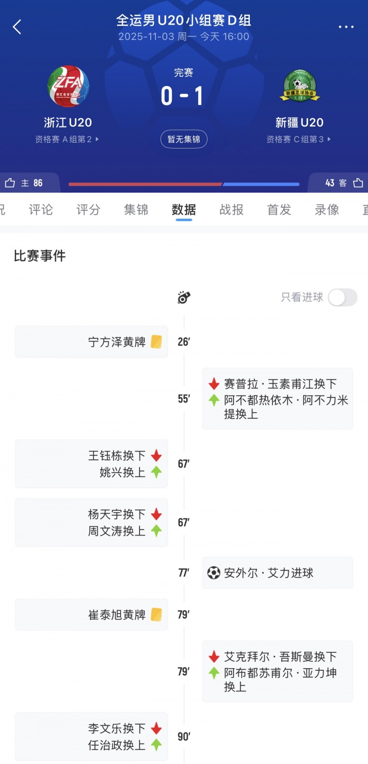 全运会男足U20组别D组第二轮,浙江队0-1不敌新疆队。王钰栋首发第67分钟被换下!
