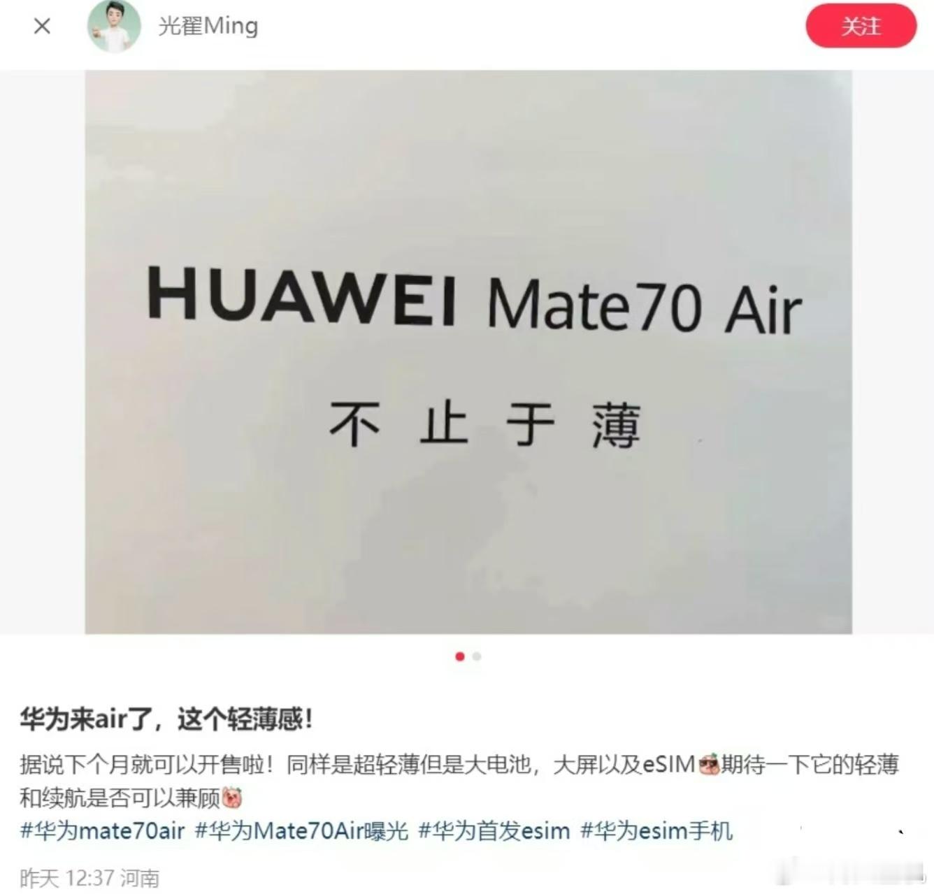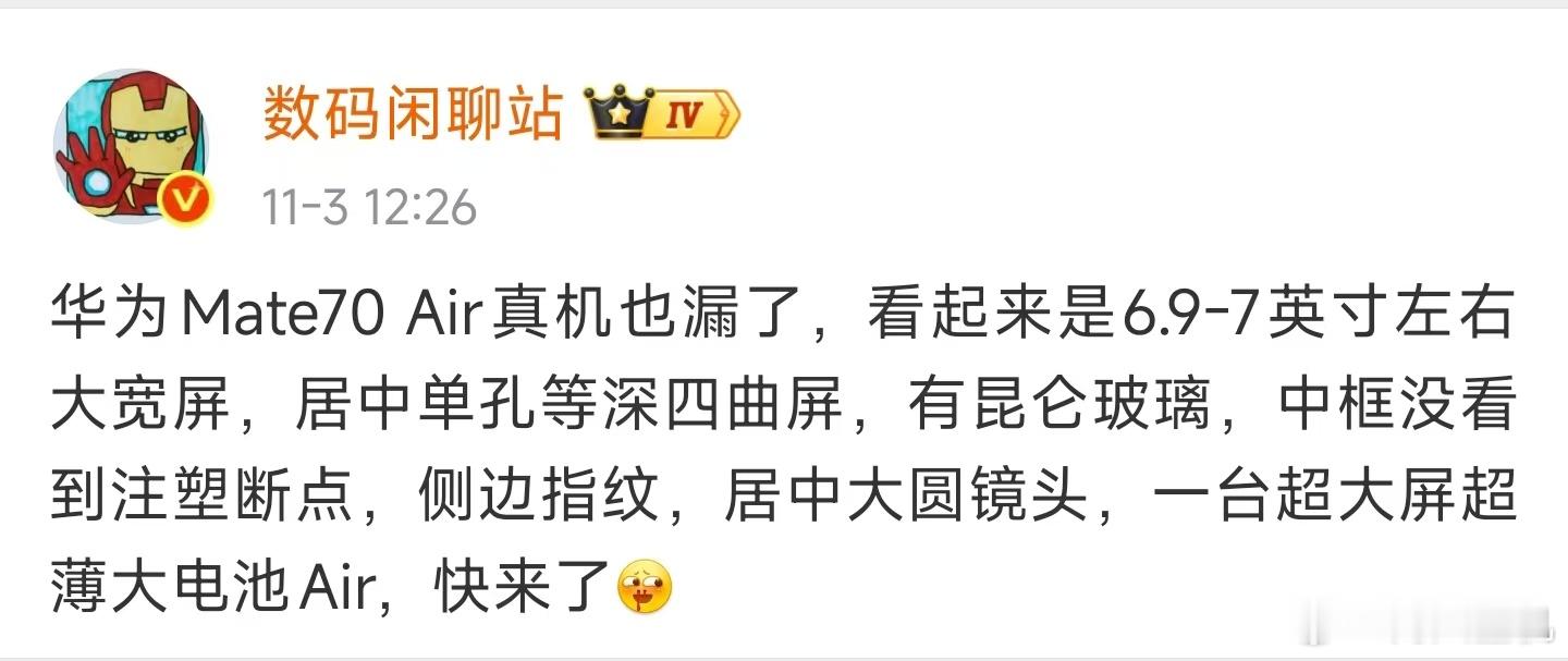 今年看来Air是潮流啊,从iPhone Air,三星的s25edge开始,估计行业内也开始掀起了一阵轻薄潮流了。只是这两个国际大厂的Air的配置都不咋地啊,价格也不便宜,大家觉得缺乏诚意。从数码闲聊站的爆料来看,居中单打孔设计,也有昆仑玻璃。不过也有妥协的点,中框上没有注塑断点,看起来像塑料中框。电源键应该也是带侧边指纹的,所以大家期待这次华为的Air吗? 数码科技评论[超话]