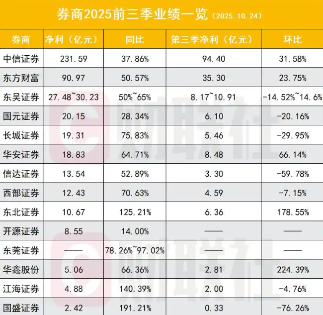 Wind统计,今年前三季度,中信证券、国泰海通、华泰证券、中国银河、广发证券分别实现净利润231.59亿元、220.74亿元、127.33亿元、109.68亿元、109.34亿元,排名行业前五。从净利润增幅来看,11家券商净利润增幅超100%,24家券商净利润同比增长超60%。2家券商净利润增幅低于10%,分别是首创证券和华泰证券。