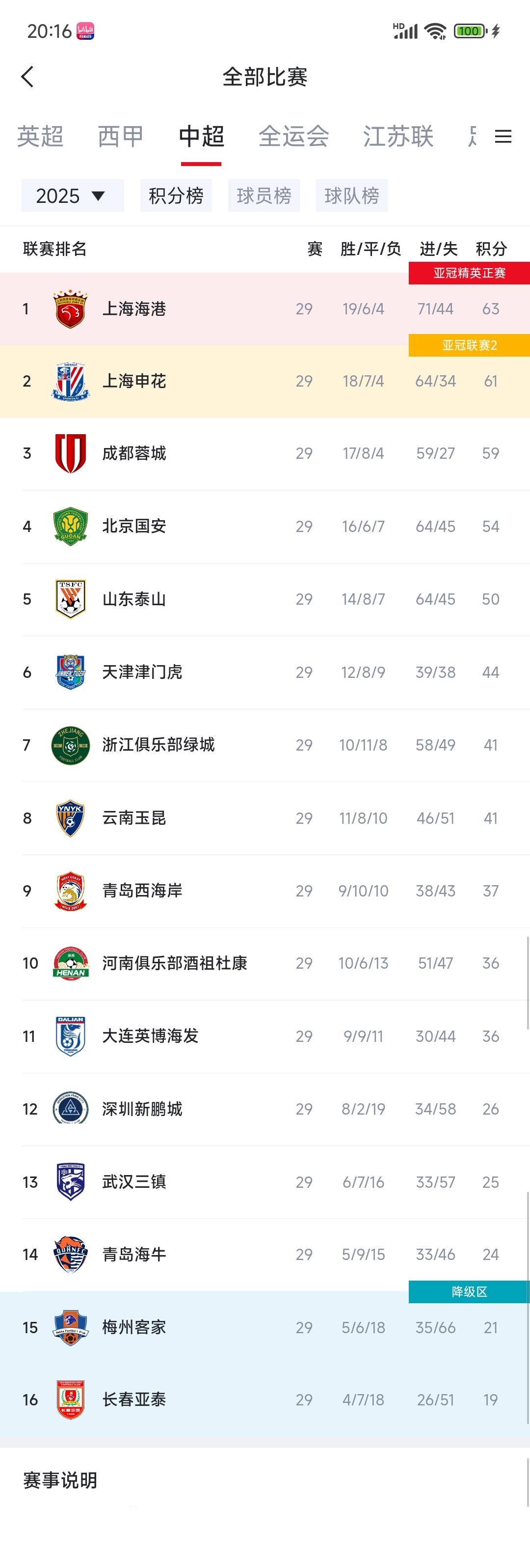 我看到一种说法,如果今年没有苏超,今年中超是最精彩的一年! 因为中超冠军要在最后一轮产生。 中超降级队,也要在最后一轮确定。 上海海港领先上海申花2分,只能说大概率夺冠,也有可能丢冠。 青岛海牛也有可能降级,梅州客家存在一线生机。 可惜光芒被苏超掩盖,据说苏超决赛收视率破2%,那就是今年最牛的项目呀。 不过没苏超,我感觉中超也就这样,不看的人的居多,只有上海申花,上海海港球迷还在关心!![笑哭]