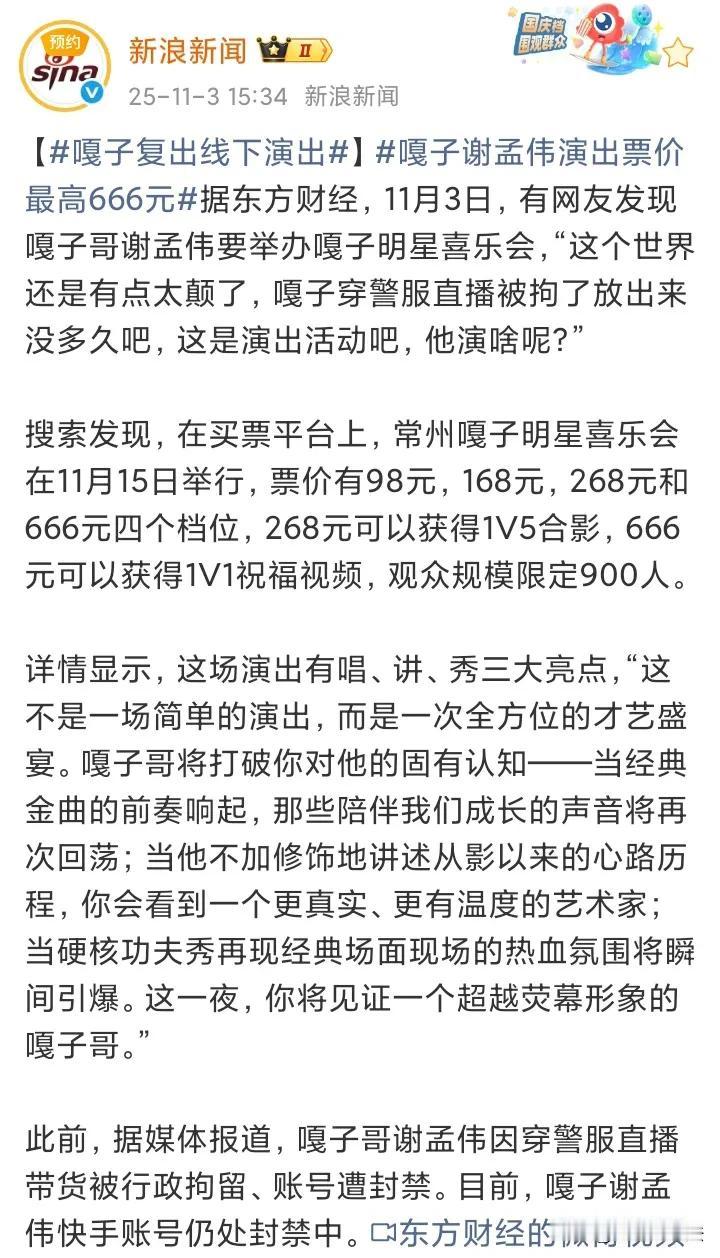 一点底线都没了,谢孟伟居然复出了!11月15日他将在江苏常州举办线下喜乐会,票价分别是98、168、268、666这4档,268可以1V5合影,666可以获得1V1祝福视频。 他有权利工作,但是不是不应该有资格继续从事这个行业,毕竟无论从哪一方面来看他都是劣迹艺人了,如果他能复出,那其他劣迹艺人是不是都能复出? 另外,他的活动全称是“嘎子明星喜乐会”,他这不是在污名化抗日小英雄嘎子吗?是谁允许他继续用这个名号的?