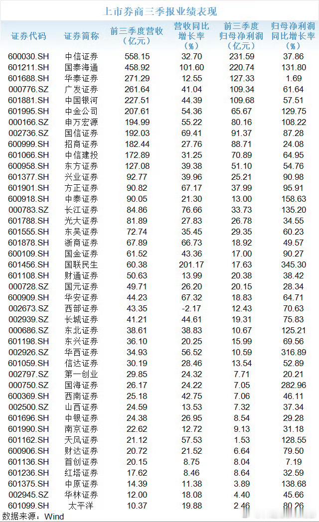 Wind统计显示,今年前三季度,42家上市券商合计实现营收4195.61亿元、归母净利润1690.49亿元,净利增幅超六成。除西部证券之外,其余上市券商当期均实现增收增利。