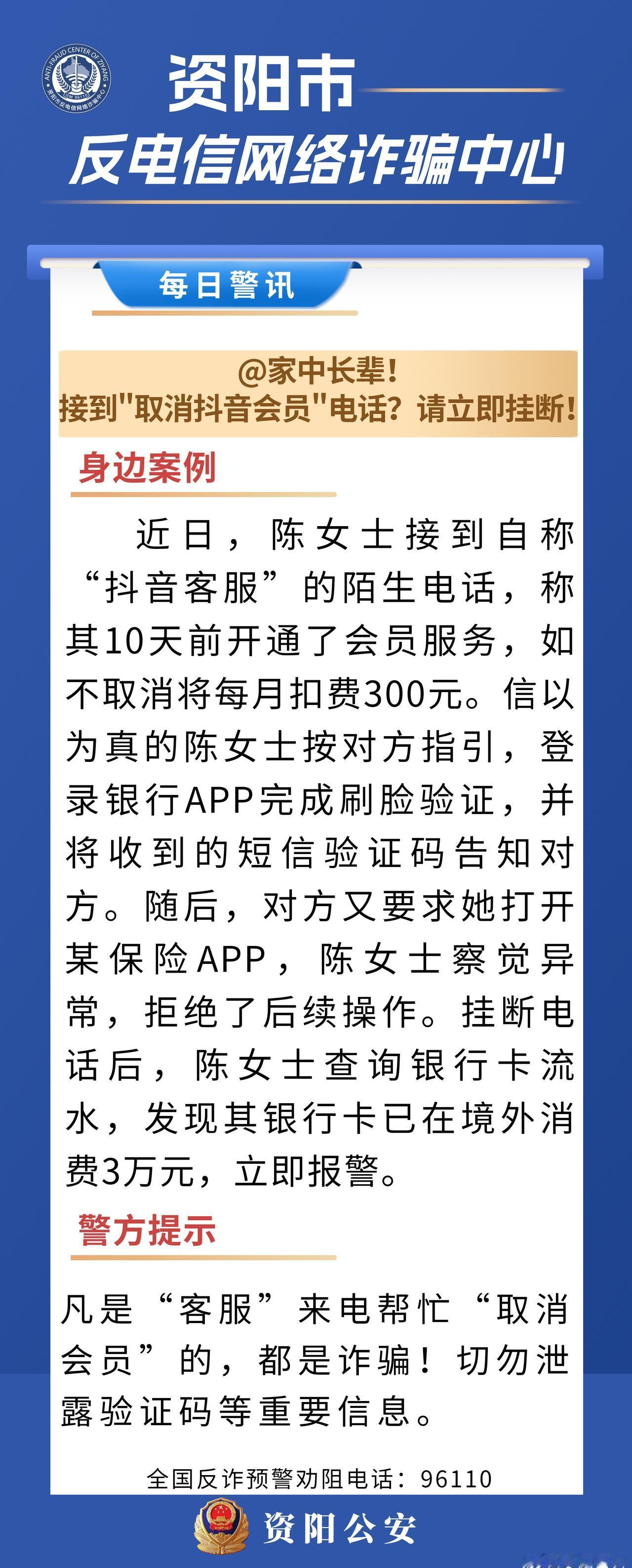 @家中长辈!接到"取消抖音会员"电话?请立即挂断!