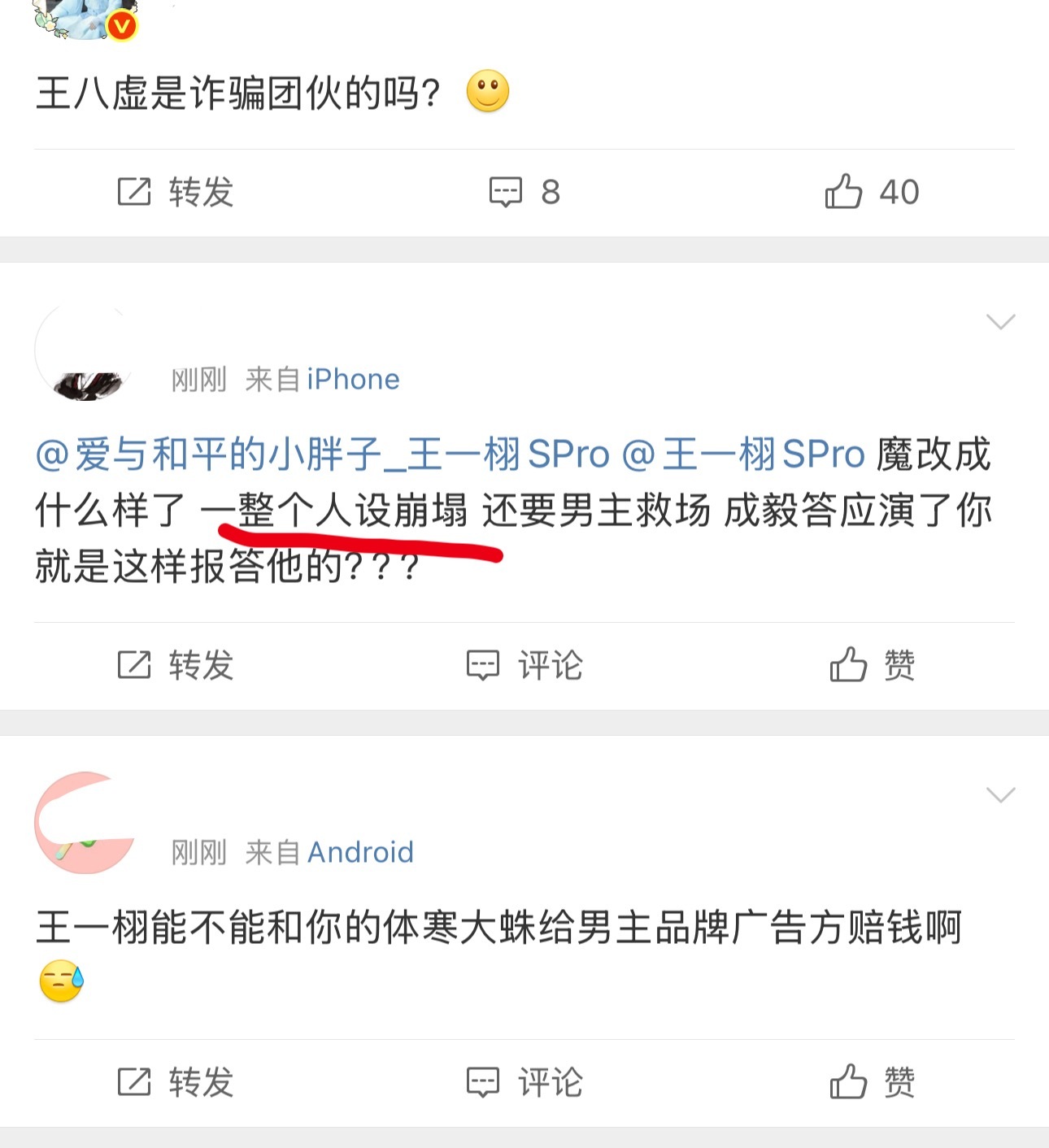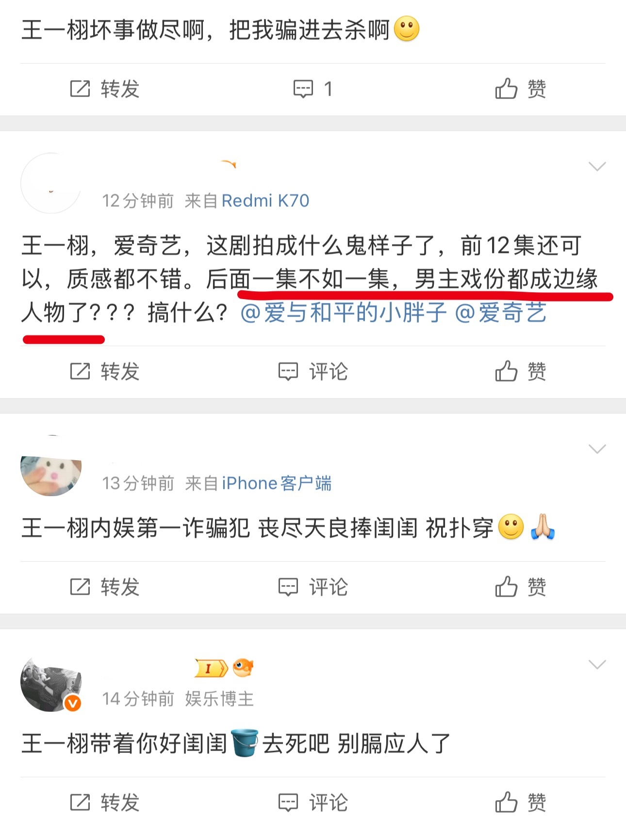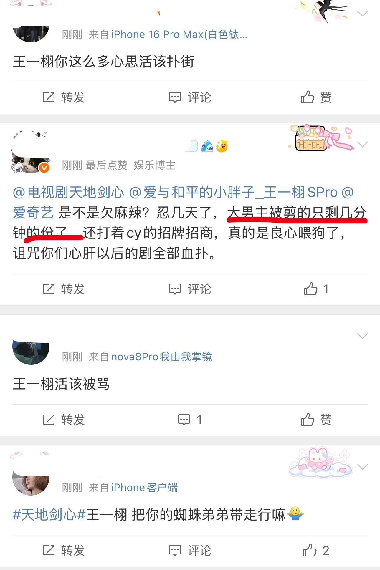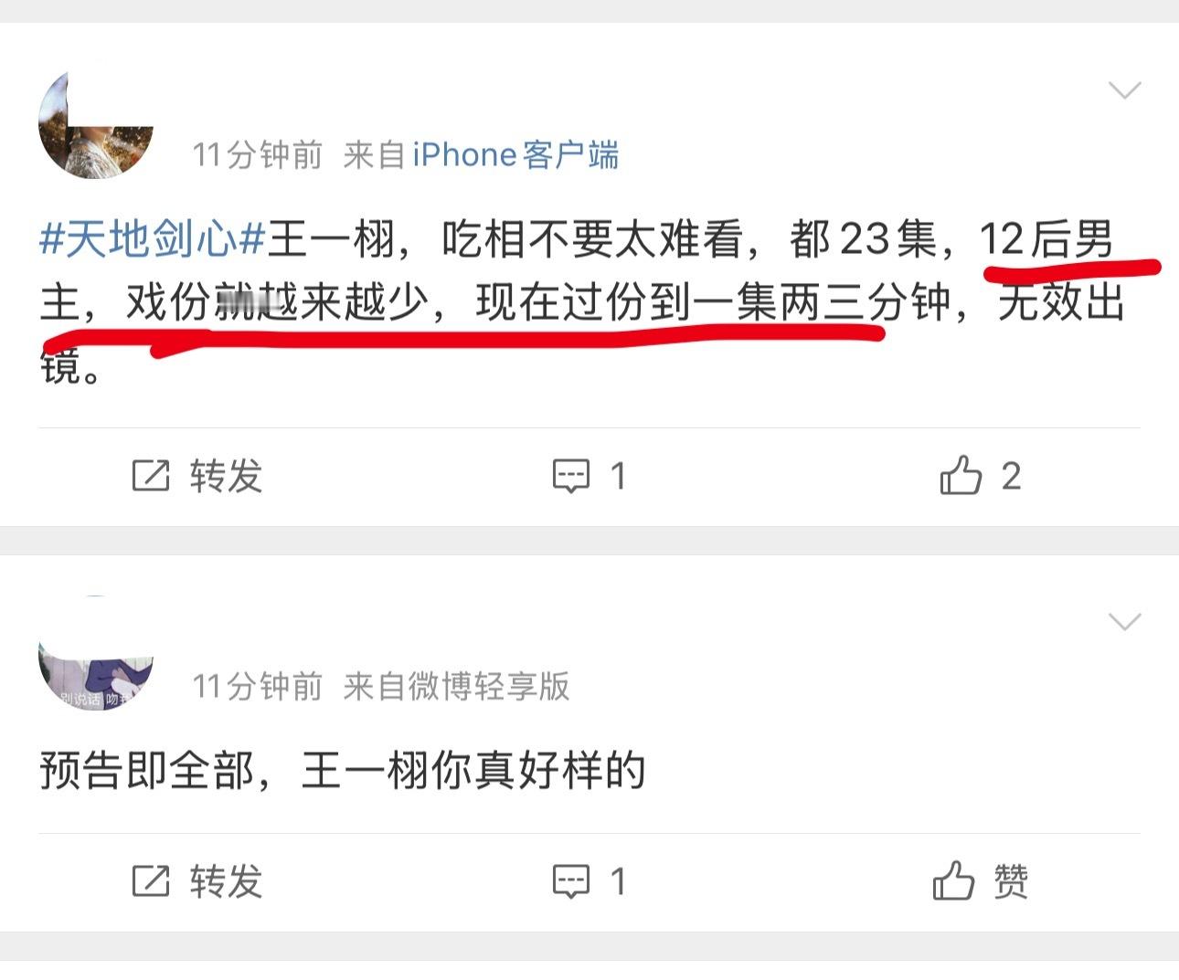 因为最新更新的几集天地剑心,成毅戏份太少(每集有效戏份2-3分钟)王一栩正在被