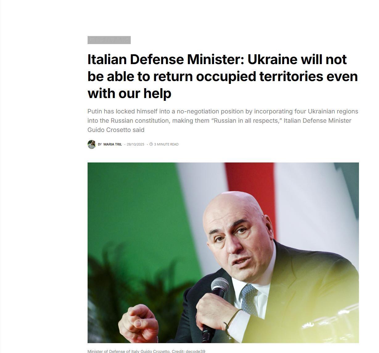 意大利防长:【乌克兰拿不回那些土地了,就算有北约帮忙也拿不回。】 意大利防长克
