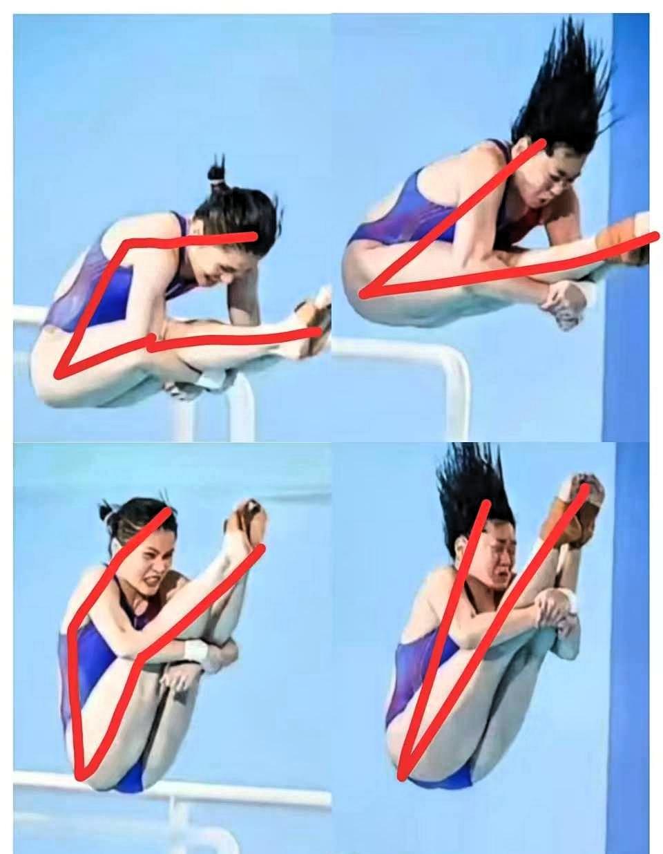 没有对比就没有发言权, 左边是王伟营,右边是全红婵 全红婵和搭档的跳水同框对比,直接把“努力”和“极致努力”的差距焊死在眼前,看完既佩服又狠狠共情,这才是全民喜欢婵宝的原因! 以前总觉得婵宝的“零水花”是老天爷追着喂饭,14岁一战成名的传奇,怎么看都带着“天生开挂”的滤镜。直到看清这组特写才恍然大悟——哪有什么天赋异禀,全是把细节抠到骨子里的硬功夫! 别人跳水团身是“尽量蜷缩”,婵宝是精准到毫米的“人体折叠术”:头紧紧贴住后背绷成一条直线,双腿并拢得没有一丝缝隙,就连脚尖都绷得笔直对齐,整个人像块无缝衔接的流线体,入水瞬间几乎没给水花留任何冒头的机会。 再看旁边的搭档,不是不努力,反而拼尽了全力。拼命把头往腿上凑的样子,像极了体育课练坐位体前屈的我们:弓着背、憋着脸,费了九牛二虎之力才勉强碰到膝盖,那种“我已经拼尽全力,却还是差一点”的真实感,瞬间戳中无数普通人的心声。 生活里的差距从来不是天赋,而是对细节的较真程度。普通人做到“合格”就满足,顶尖选手却要把每个动作磨到“无可挑剔”。婵宝的零水花,藏着日复一日对着镜子调整姿势的坚持,藏着千百次跳水后依然不肯放松的脚尖,藏着把“差不多”变成“必须精准”的执念。 婵宝的可爱之处,在于她没有距离感。她用最朴素的努力告诉我们:所谓天才,不过是把别人敷衍的小事,当成必须攻克的难关;所谓传奇,不过是把重复的动作,练到极致的完美。
