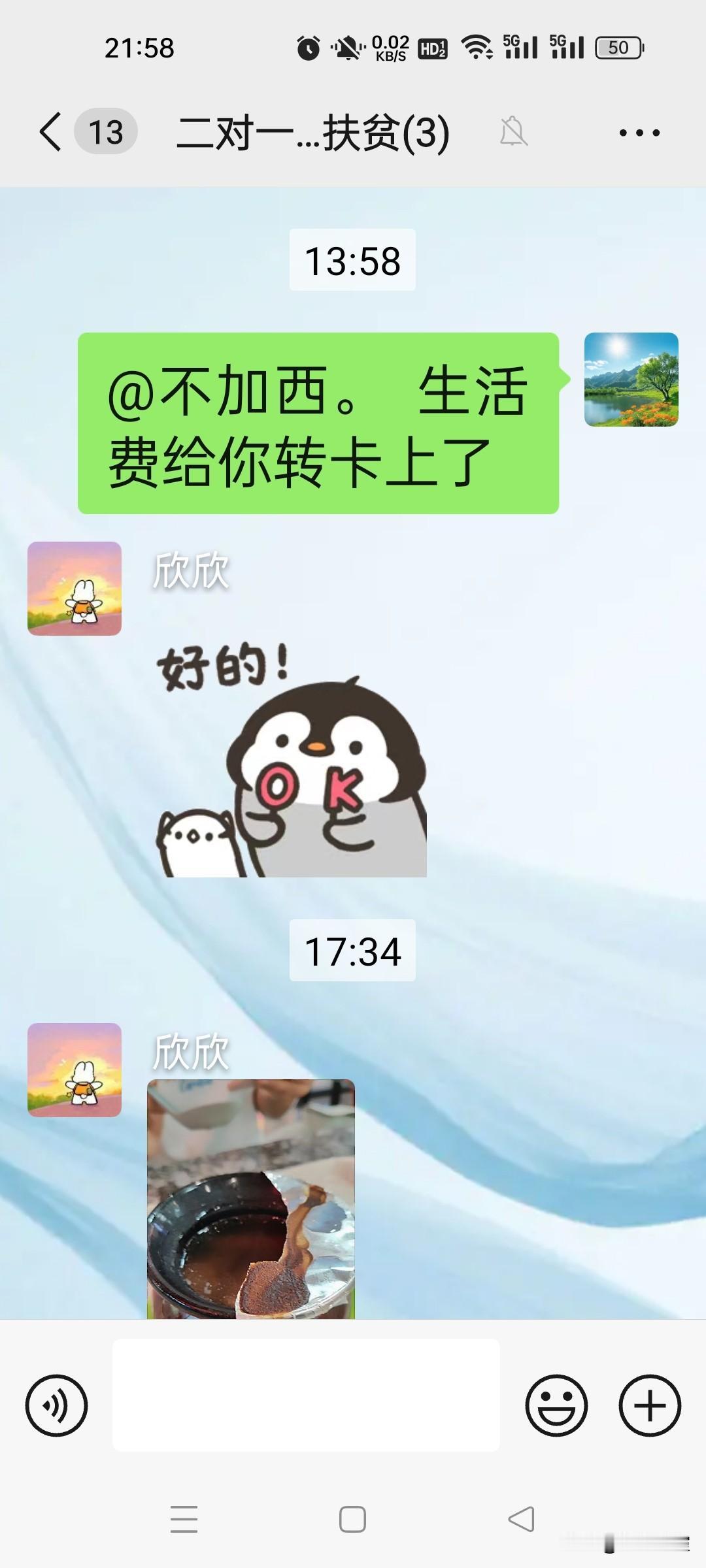 上午,又给闺女转生活费。 闺女上大学第一年,我每月给她1500块钱生活费,一直到2023年10月。后来我开始给她每月2000。 一直以来 , 我对孩子们花钱方面限制得很严。尽管如此,闺女小时候花钱还是要比儿子小时候花钱要多的多。用闺女的话说,就是不是一个年龄段,再就是条件在好转。 闺女说的也不无道理。相比我们邻居家,也是一儿一女。他家儿子上大学上研究生,又给儿子在北京二环以里买了房,闺女只上了个大专,在卫生院做临时工,闺女提出要县城的一套房,邻居也答应了。跟我说不能太过偏向了呀。 我家闺女向来对钱啊房啊没啥概念。这一点还好。于是我就睁一只眼闭一只眼地,不计较多给她点零花钱了。从去年开始,她让我每星期给她一次,每次500。我问她为啥这样,她说不用费心算计30天怎么支配,我只管一星期的支配就行, 省得前松后紧。一星期过完了,钱也花的差不多了,又有盼头了。哈,有心思了。我一想也行啊,也省得我一次给2000有压力。 于是就这么给了2年了。今天周一又给她转了500。生活费就是生活费,不包括买书报名考试之类的费用。偶尔也给她发个小红包鼓励鼓励啥的。 养孩子真不容易呀。管学习,管花钱,管成长,一路走来和孩子斗智斗勇。[捂脸][捂脸]