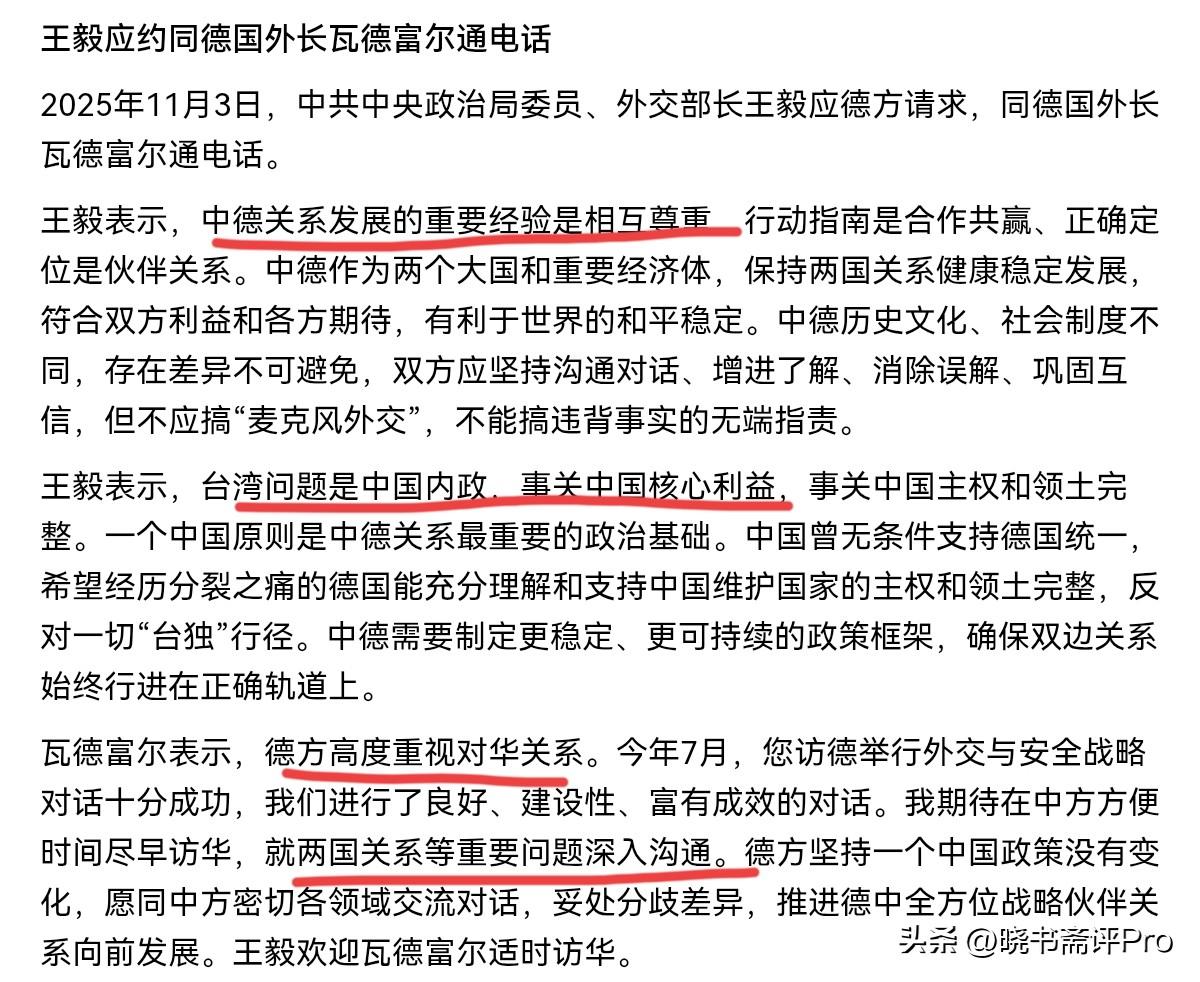 德国态度变了!德国外长忍不住还是主动跟我们打来电话,王毅外长把话说的很明白,这一次德国外长态度好多了!11月3日,根据国内媒体报道,应德国外长的要求,我们的王毅外长与德国外长瓦德富尔通了电话。而当着德国外长的面,王毅外长表示,其一,中德关系的正确定位是伙伴关系。其二,王毅外长告诫称,不应搞“麦克风外交”,不能搞违背事实的无端指责。 其三,王毅外长点出,一个中国原则是中德关系最重要的政治基础。很显然,王毅外长这是最起码在三方面对德国外长亮明了态度。为什么王毅外长讲这一番话,这当然是因为此前德国外长有错误的言行,偏离了中德打交道正确的方向,而我们有必要就此阐明立场。 很显然,在经历了此前的延期访问风波之后,这一次主动打来电话的德国外长态度明显好了很多。面对我们的外长,德国外长瓦德富尔表示,德方高度重视对华关系。德方坚持一个中国政策没有变化,愿同中方密切各领域交流对话,妥处分歧差异,我期待在中方方便时间尽早访华。 很显然,尤其是德国外长表示,坚持一个中国政策没有变化,这明显是纠正此前在台湾问题上的所谓德国“自行决定政策具体实施方式”,反对以武力改变台海现状。而期待访华,期待交流和对话,这说明德国改善跟我们关系的想法,非常的迫切。无疑,德国能够改正不当言行,务实的处理对华关系,这是一个好的迹象,相信中德互动能够很快走入正确的轨道。