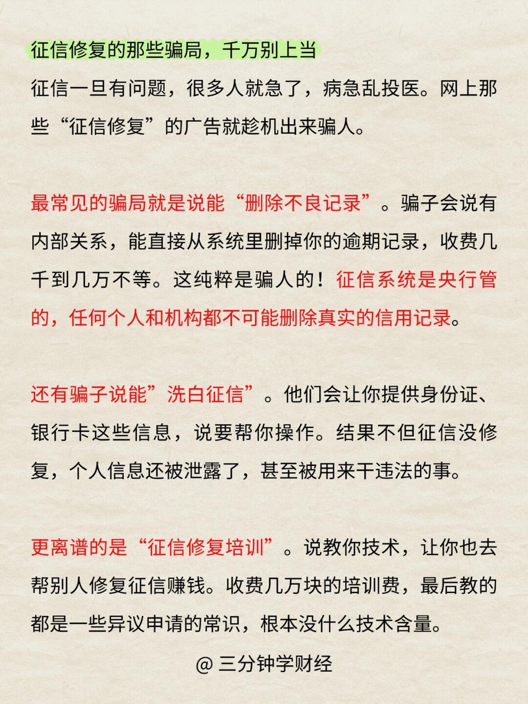 要是征信真有问题,先把欠款还了,乖乖等5年(逾期记录自动消),千万别信“修复”骗局。实在不懂,去人民银行问问,或者找正规银行工作人员咨询,别听那些“天上掉馅饼”的忽悠。