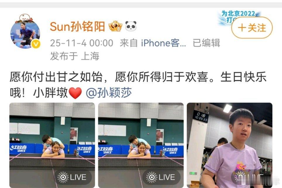 孙铭阳又卡点为孙颖莎送生日祝福了,莎宝,愿你付出甘之如饴,愿你所得归于欢喜。生日快乐哦!小胖墩❤️