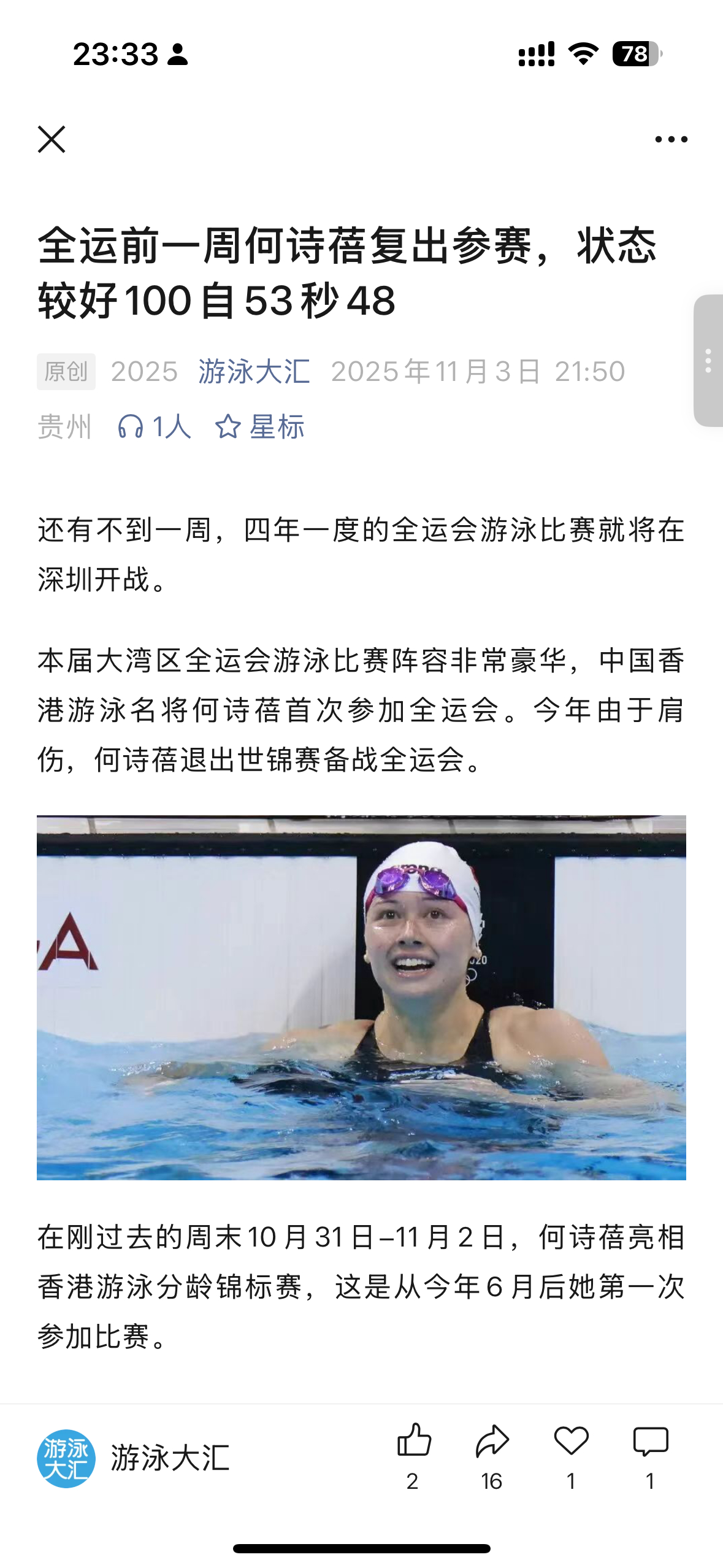 何诗蓓100自游出了53秒48的成绩,对吴卿风和程玉洁来说都是一个不大不小的挑战。全运会全运日记