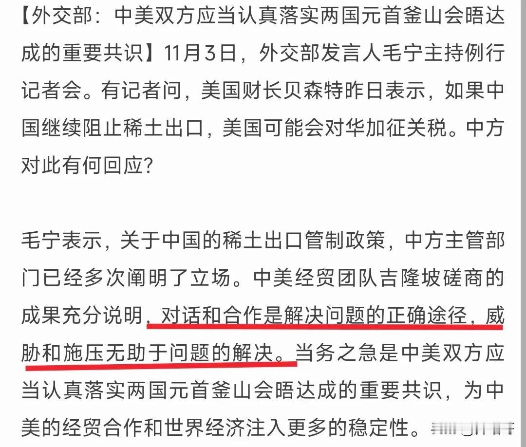 11月2日,贝森特在美国媒体采访中声称,美方做好了反制准备,如果中方不解决稀土出口管制问题,那美方就将重新对中国商品加征高关税。他的外交发言,可以说让原本在韩国取得一定外交成就的两国领导人蒙羞,更是向世界证明美国为了达到自己的目的,而毫无契约精神,很显然这就是强盗逻辑,可以预见一旦美国获得了其想要进口的稀土存量,一定会反手更为严酷的在贸易上打压中国,对于这种言而无信的国家,我们一定要听其言而观其行,做好反制。中国对美稀土