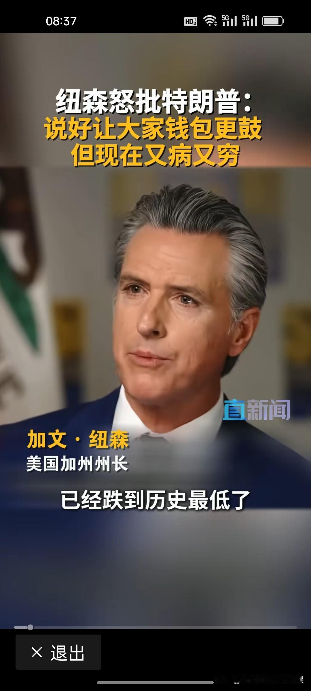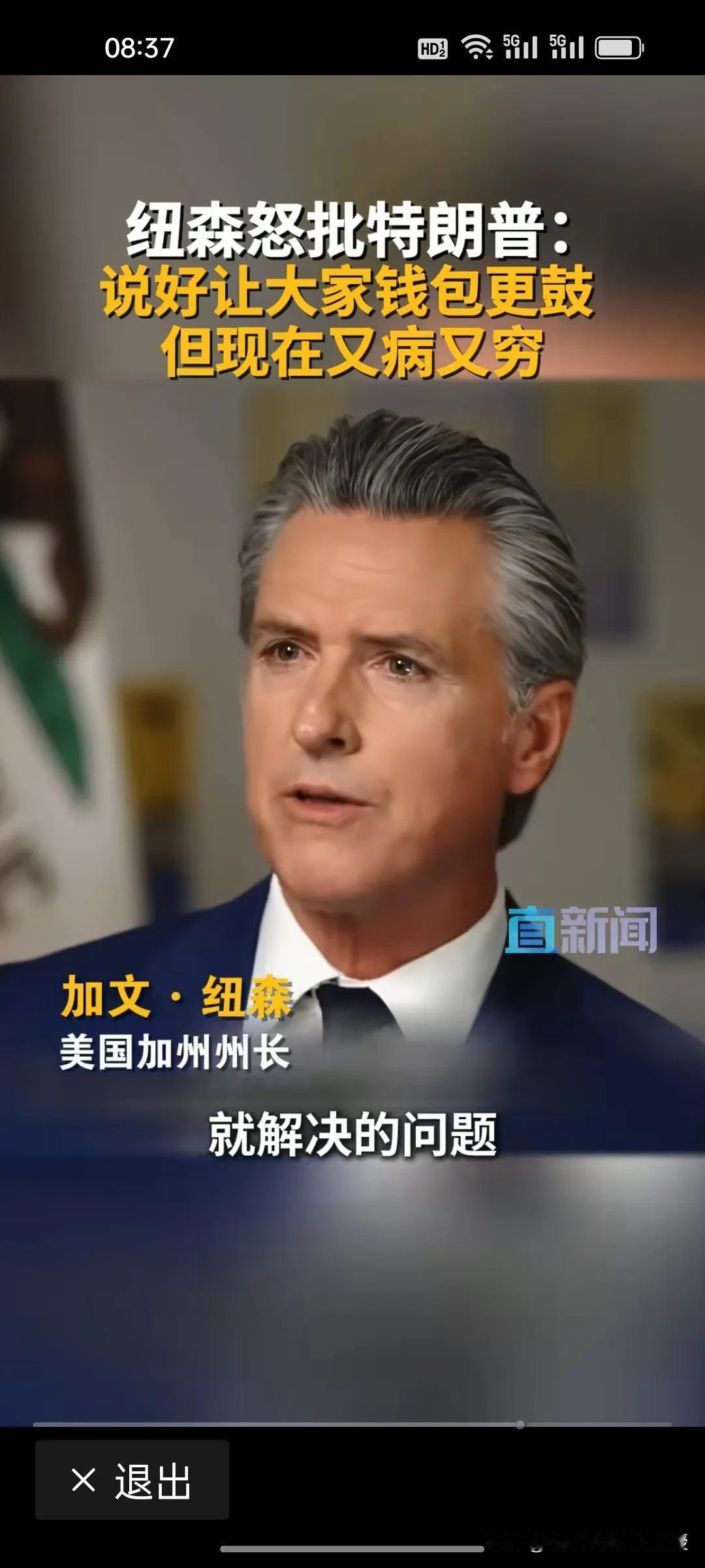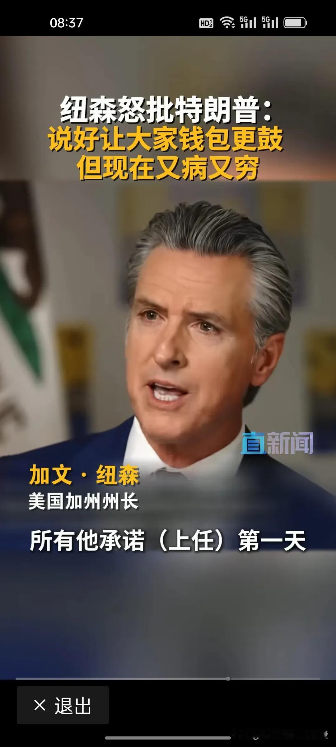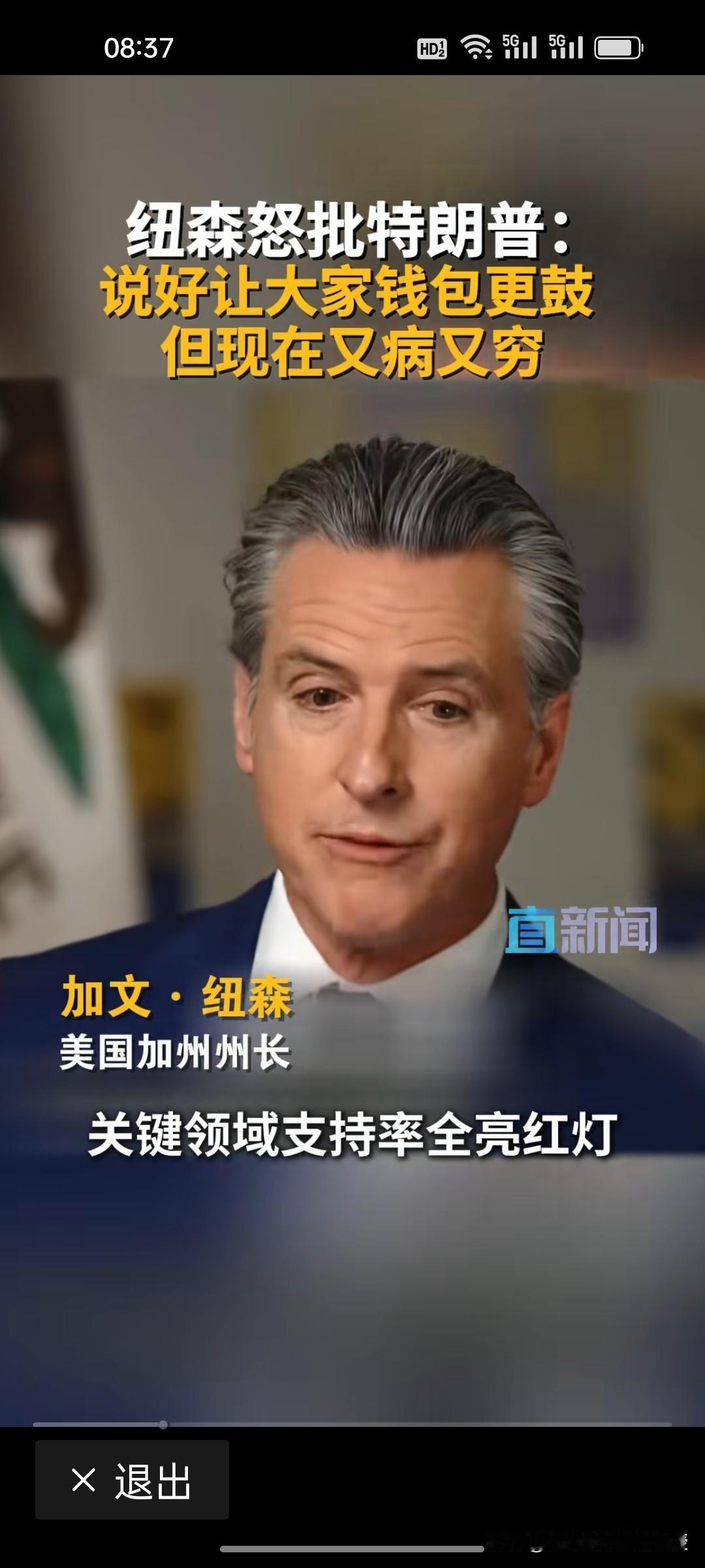 美国加州州长纽森这番话可能会让纽森的总统选举支持率大增啊!纽森说他考虑下一届总统参选,昨天他接受了美国媒体采访,说特朗普的支持率已经降到历史最低了。他的政策比本人更不得人心。当初说好的让美国老百姓过得好,腰包更鼓,现在老百姓又穷又病,还物价飞涨。特朗普承诺的上任第一天就要解决的问题,到现在一个都没有解决。 确实是这样,特朗普上任至今,虽然天天声称是一位”和平总统“,解决了8场战争,可是现在连美国政府都已经关门了,军饷都发不出,公务员都排长队等救济。再看看特朗普却把白宫的东翼拆了,要建豪华的宴会厅,把林肯浴室拆了,要件特朗普喜欢的金碧辉煌的厕所。昨天更被美国媒体爆料,特朗普在海湖庄园大开派对,歌舞升平,这是还有4200万美国人等着救济的当下,特朗普却可以和一群朋友们吃着昂贵海鲜,夜夜笙歌。
