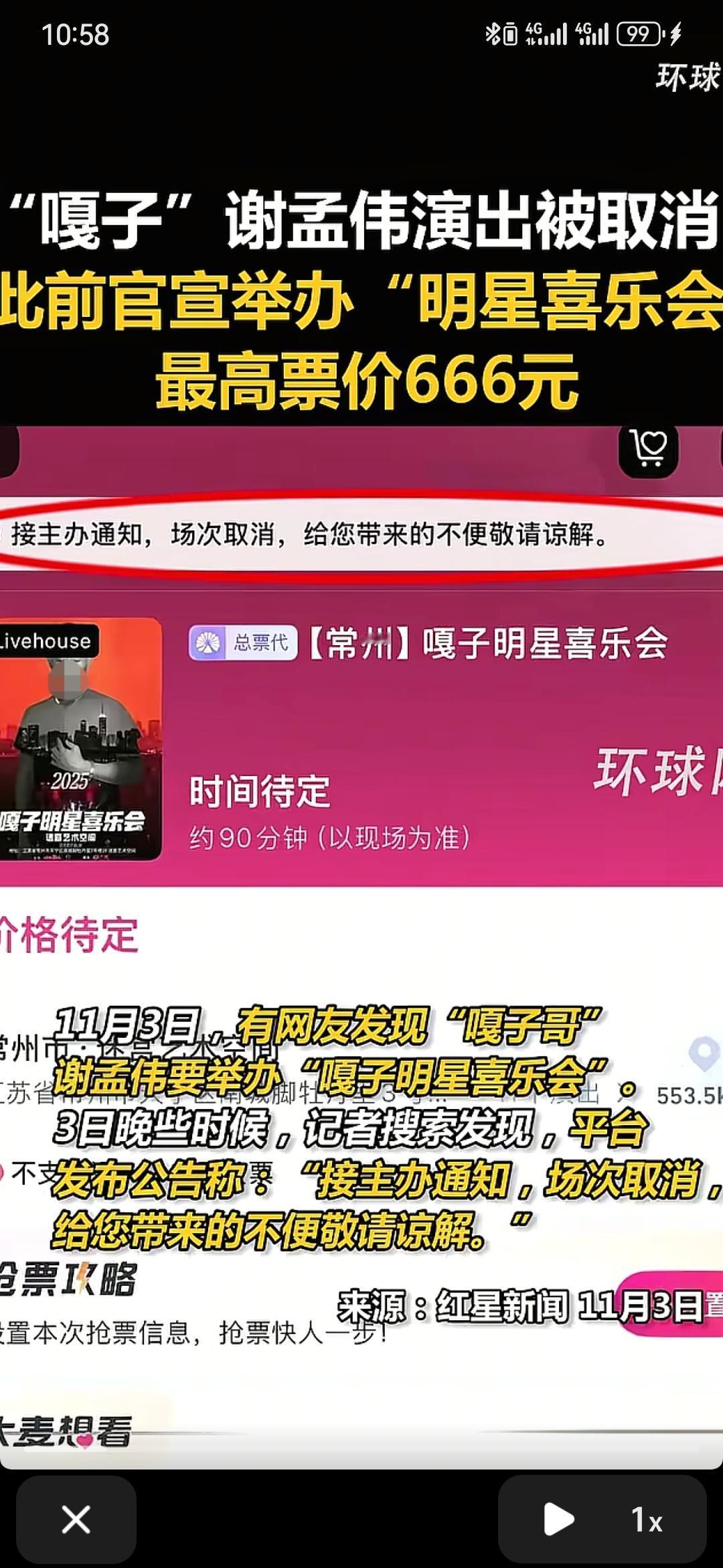 招笑!嘎子(谢孟伟icon)打算在常州举办“明星喜乐会”,在平台上面推出了: 98元,168元,268元和icon666元的档位 268元的可以有1V5的合影 666元的可以1V1祝福视频 搞笑的是,这个活动刚在平台上线没多久,网友直接投诉,然后就被主办方取消掉了 网友1:这是演出活动,他演啥呢? 网友2:我感觉他比我还缺钱 这刚放出来就开始捞钱,这是咋想的?