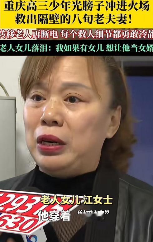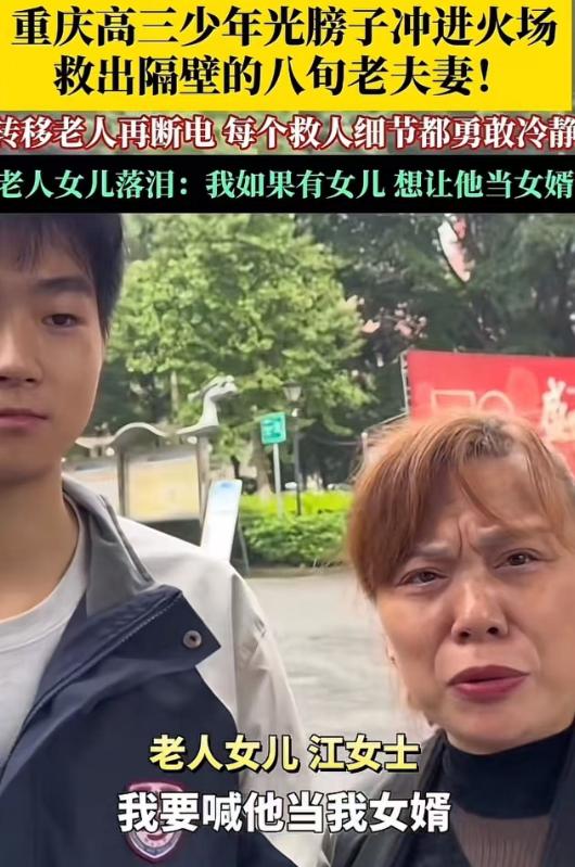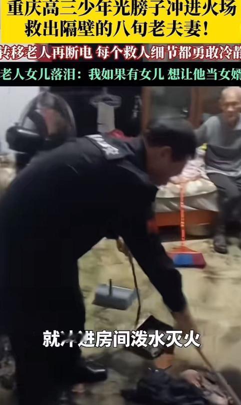 笑死了!重庆高三少年冲进火场救出了邻居大爷大妈,大爷女儿哭着感谢少年时,一句话把大家逗笑了! 重庆铜梁一小区的夜晚突然炸响,跟打雷似的,高三学生祝野刚下晚自习歇下,听见隔壁动静立马光着脚冲出门。 虚掩的房门冒浓烟,火光从缝里往外窜,八旬的朱婆婆在屋里哭喊“啷个得了”,手指和腿已经被烧伤。 这是电动轮椅充电炸了,火星溅得满屋子都是,祝野没犹豫直接冲进了着火的房屋里,但是烟雾太大呛导致举步维艰,正好他看见江大爷瘫在轮椅上咳得直不起腰,轮椅还被杂物卡着动弹不得。 他一把清开障碍物,扶着两位老人往门外挪,浓烟裹着热浪往脸上扑,鼻子嘴巴很快沾得乌黑,手也被火星烫出红印。 好不容易把人护到楼道,又折回去找水浇灭零星火点,还用烧破的衣服摁灭轮椅上的明火,等物业保安赶来,他已经累得蹲在地上直咳嗽,活像个刚从烟囱里爬出来的小花猫。 第二天一早,老人的女儿江女士拎着水果找上门,一看见祝野,眼泪立马掉下来,攥着他的手不停道谢。 听说救人事的是个刚满十八的高三学生,她哭得更凶,突然抹把脸笑出声:“这娃儿太勇敢了!我要是有女儿,非得喊他当女婿!” 这话一出口,围着的邻居全笑了,祝野挠挠头,脸跟被烟火熏过似的红,江女士后来又往学校跑,塞红包被拒,干脆捐了十套羽毛球装备,她打听着祝明是体育特长生,羽毛球打得好,刚拿了市级比赛名次。 小区里没人不夸这娃,保安邹兴伦说,晚来五分钟老人就危险了,祝野不光救人还灭了火,保住半栋楼安全。 邻居杨兴碧看着他长大,说这孩子平时就帮老人拎菜、取快递,关键时刻敢往前冲,是真有担当。 消防部门后来用这事讲安全课,说祝野的操作是“教科书级”:先断电再救人,不贪功冒进,网友更直接,给这“赤脚英雄”点赞,说他光着脚冲出去的样子,比任何奖状都亮眼。 其实哪有天生的勇敢,祝野事后说有点后怕,但听见呼救不能不管,江女士那句玩笑话里藏着真感激,邻里的笑声里裹着暖意,凑成最实在的人情味儿。 就像重庆人常说的,这座城里从不缺好心人,而这份勇敢,早悄悄长在年轻人的骨子里了。