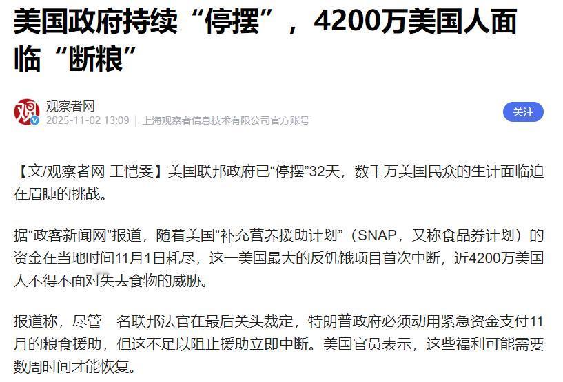 美国版的“朱门酒肉臭,路有冻死骨”。 今年的万圣节前后,佛罗里达州棕榈滩的海湖庄园灯火辉煌,美国总统特朗普在此举办了一场盛大的万圣节派。派对现场名流云集,装饰极尽奢华,各式主题装扮和精致餐点彰显着顶级盛宴的排场。而受邀嘉宾们也都谈笑风生,享受着节日的狂欢与精致生活。 然而,就在这场奢华派对热闹举行的同时,美国另一端却上演着截然不同的景象。 由于联邦政府陷入关门僵局,补充营养援助计划SNAP(即食品券计划)的资金耗尽,约4200万美国民众瞬间失去了赖以生存的食品援助。 这些人中不乏低收入家庭、单亲母亲、 老年人群和残障人士,他们原本依靠每月的食品券购买面包、牛奶、蔬菜等基本生活物资,如今援助中断,许多家庭不得不开始精打细算,甚至有人面临断炊的困境。 美国各地的食品银行前也排起了长龙,不少人带着焦虑的神情等待领取有限的救济物资。 而造成这种冰火两重天局面的根源,在于美国政府始终将资本利益置于民生之上。 按照美国法律,联邦政府需通过年度预算法案才能运作,但2025年国会两党在预算博弈中,优先考虑的是背后资本集团的诉求,对关乎4200万人生计的食品券计划却漠不关心。 两党在削减福利开支、维护资本减税等议题上争论不休,却迟迟不愿为民生福利妥协,最终导致政府关门、食品券资金耗尽。 美国农业部(USDA)虽声明SNAP计划依赖预算拨款,但政府在僵局中从未真正将民众温饱放在首位,反而任由资本支持的政治博弈持续发酵。 美国两党之争导致的民生相关部门关门并不罕见,而每次受损的都是依赖福利的普通民众,可与政府紧密勾结的资本家阶层却几乎不受影响。福利项目总是最先被牺牲的对象,资本相关的补贴、减税政策却鲜有动摇。 海湖庄园里名流们的奢华派对,本质上是资本与权力交织的缩影,他们能在政府停摆期间依旧享受精致生活,正是因为政府的决策始终围绕着资本的利益转动,对底层民众的死活视而不见。 一边是资本精英毫不节制的挥霍,一边是普通民众为一口饱饭焦虑排队,天堂和地狱的割裂就在美国真实上演。