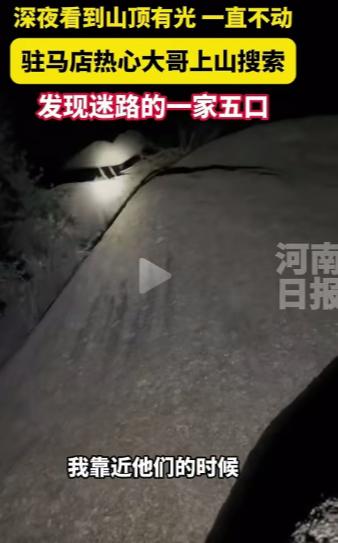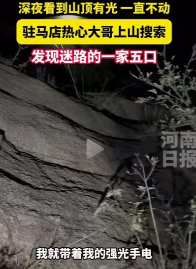 河南驻马店,男子深夜看到山顶有光一直不动,于是上山搜索,结果发现迷路的一家五口!网友:一般人即使知道看到有光,也不会想到会有人被困。大哥不仅想到了,而且做出了行动!真是好样的! 河南驻马店的后山,半夜里黑得像泼了墨,只有风刮过碎石子的声音。 乱石堆里缩着五个人,三个小孩最大的刚到大人腰,最小的还攥着半块没吃完的饼干,小脸冻得通红。 他们是白天来山上玩的,跟着一条小路上来,看够了野果子和松树林,转头就找不着回去的路了。 天越黑风越冷,手机没信号,只能开着手机手电筒亮着,那点光在黑夜里像颗小豆子,钉在山顶没动过。 山脚下的李大哥,那会儿刚在院子里把最后一筐红薯搬进屋。 身上沾了点土,他拎着水壶想喝口水,抬头擦汗的功夫,就瞥见了山顶那点光。 一开始以为是天上的星星落错了地方,可盯着看了两分钟,那光没挪一寸。 他琢磨着不对——要是赶夜路的人,光该跟着脚步动;要是村里的灯,也照不到山顶那位置。 山里后半夜能冻得人手指发麻,要是真有人困在那儿,小孩哪扛得住? 李大哥没多想,回屋翻出件厚棉袄裹上,又摸出那把采蘑菇用的强光手电——电池是满的,照得远。 换了双防滑的胶鞋,揣了两个早上蒸的馒头,临出门跟媳妇喊了句:“山顶有光不动,我去看看,别等我。” 后山的路没修过,全是坑坑洼洼的碎石和盘着的树根。 李大哥用手电照着脚底下,一步一步往上挪,走几步就朝着光的方向喊:“山上有人没?迷路了就应一声!” 喊了四五声,才听见黑暗里传来细弱的声音:“有……我们不敢走了。” 他顺着声音往那边赶,脚底下被树根绊了一下,踉跄着扶住树干,手电光晃了晃,没灭。 找到那家人时,三个小孩正挤在两个大人中间,手机屏幕快暗了。 李大哥把馒头掰成小块递给孩子,又把棉袄脱下来给最小的裹上,说:“跟我走,慢点儿,踩我的脚印。” 遇到小沟,他先跳过去,再把小孩一个个抱过来;碎石多的地方,他用手电照出一条稳路,让大人牵着孩子跟在后面。 就这么走了快一个小时,才把人带到山脚下的大路上。 那家人要给李大哥钱,他摆手推回去:“不用,赶紧带孩子回家暖和,别冻着。” 还叮嘱:“以后带孩子上山,要么问清路,要么早点回,别瞎闯。” 后来村里有人路过,拍了段李大哥送他们下山的视频,发在网上,评论区就热闹了。 有人说“换我看见那光,早回屋睡了”,有人说“这大哥心细,还想着带馒头”,还有人说“幸好遇到热心人,不然这家人遭罪了”。 这事儿不是独一份,之前四川凉山也有过。 有个王大叔,深夜听见山上传呼救声,拿了火把就上山,在悬崖边救下两个拍星空迷路的大学生。 大叔用背篓把没力气的学生护着,慢慢带下山,网友还叫他“凉山夜行者”——都是普通人,没想着当英雄,就是多了份心眼,多走了步路。 驻马店日报后来也提了这事儿,说李大哥在村里本来就热心,谁家收麦子缺人手,他准去搭把手。 邻居家孩子放学没人接,他顺道就捎回来。 有人问他当时怕不怕,他说:“怕啥?就想着别让人家在山上冻太久,尤其是那几个小孩,看着怪可怜的。” 其实说到底,这事儿没多复杂——一束没挪窝的光,一个愿意上山的人,一家子被困的人。 要是李大哥没多瞅那两眼,要是那家人提前算好下山时间,都不会有这桩事。 可也正因为这些“刚好”,才让黑夜里多了点暖。 网友吵来吵去,说到底也是盼着这样的“刚好”能多些,盼着有人愿意为陌生人多搭把手。 那么到最后,你们怎么看呢? 如果各位看官老爷们已经选择阅读了此文,麻烦您点一下关注,既方便您进行讨论和分享,又能给带来不一样的参与感,感谢各位看官老爷们的支持!