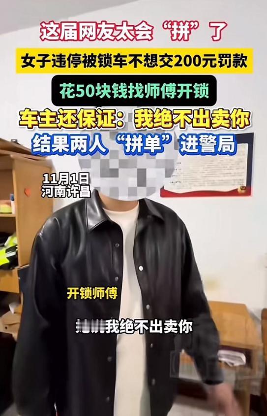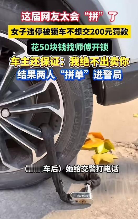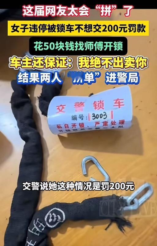 聪明反被聪明误!河南许昌,女子违停被交警锁车,不想交200元罚款,于是灵机一动,花50块钱找来一个开锁师傅开锁,结果两人“拼单”进了警局!网友纷纷调侃:“见过拼饭拼团的,还真没见过‘拼单’进警局的!” 河南许昌街头,一场“省钱大计”变成闹剧,女司机图方便,把车随便往路边一停,转头办事,等回来,车轮上多了把交警锁,挡风玻璃贴张条——违停,罚200块。 她盯着罚单皱眉,200块不算小数,脑子一转有了主意,掏出手机翻通讯录,找着个开锁师傅的电话,张口就砍价:“开个交警锁,50块干不干?”师傅那头犹豫,毕竟是执法器械,怕惹麻烦。 她赶紧拍胸脯保证,就两人知道,绝不出卖他,师傅架不住钱诱惑,应下这单。 没过十分钟,开锁师傅背着工具赶来,蹲在车轮旁,左右张望几眼,拿出家伙什儿摆弄,金属碰撞声不大,却在安静的路边格外显眼。 女司机站在一旁望风,时不时踮脚看远处,心里算着账:200变50,净省150,这笔买卖划算。 “咔哒”一声,锁开了,两人刚松口气,还没来得及交易,身后传来脚步声,回头一看,巡逻交警正盯着他们,手里记录仪没停,原来交警锁车后会在周边巡查,就防有人恶意破坏公物,刚好撞个正着。 女司机脸瞬间白了,师傅手里的工具“啪”掉在地上,交警没多话,直接招手让两人去派出所。 路上女司机忍不住辩解,说就是想省点钱,师傅则一脸懊悔,50块钱没揣热乎,先惹一身麻烦。 等到了警局,女司机先把师傅供出来,说都是对方怂恿,师傅急得跳脚,拿出聊天记录对峙,两人互相推卸责任,场面又好气又好笑。 这事传到网上,网友炸开锅,有人调侃“见过拼奶茶拼车的,头回见拼单进警局的”。 还有网友算这笔账:“200罚款不舍得,现在50开锁费加新处罚,里外里亏更多,这数学谁教的?”更有网友替师傅惋惜:“这50块赚得真‘刑’,饭碗都可能砸了。” 其实这事根本不是省钱的问题,法律专家早说了,交警锁车是行政执法,私自撬锁算故意损毁执法设备,还涉嫌妨碍公务。 女司机一开始就算错了账,她只盯着200和50的差价,没算违法的代价,开锁师傅更糊涂,明知是执法器械还动手,为点快钱把规矩抛脑后,两人都觉得能钻空子,结果把小错酿成大错。 生活里这种“小聪明”不少见:插队省时间,乱扔垃圾省麻烦,总想着绕开规则占便宜,可规则从不是摆设,越想钻空子,越容易栽跟头。 就像这起事件,原本交罚款就能解决的事,非要耍花样,最后不仅钱没省下,还得接受更重处罚,名声也落不着好。 交警后来依法处理了两人,具体处罚没公开,但明眼人都知道,这亏吃得着实不冤。