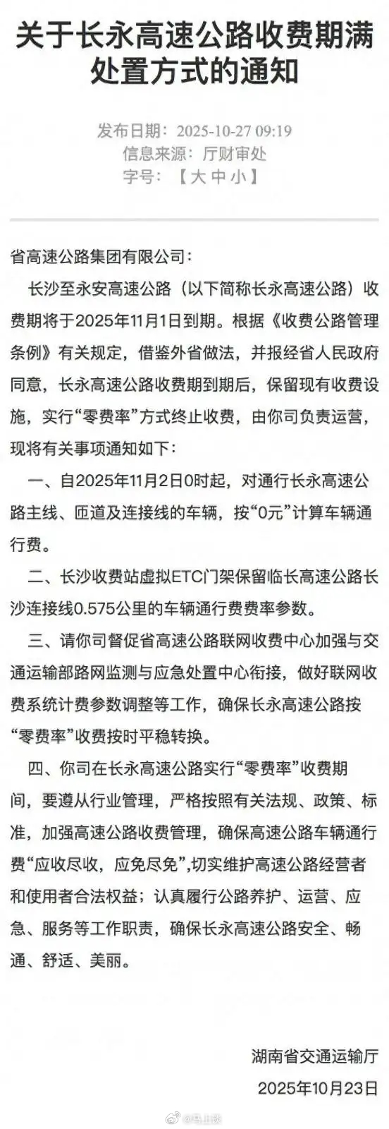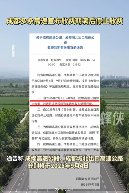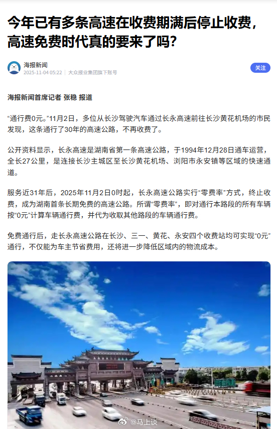 多条高速在收费期满后停止收费!好,既然当初采取“社会集资、贷款修路、收费还贷”模式,承诺收费期满后停止收费,契约精神还是得遵守的。同时,我也觉得可以收一个很低的通行费,那样养护维持的钱就有了,也可以防止有人随意开车开摩托车上高速,而非真正的通行需要。