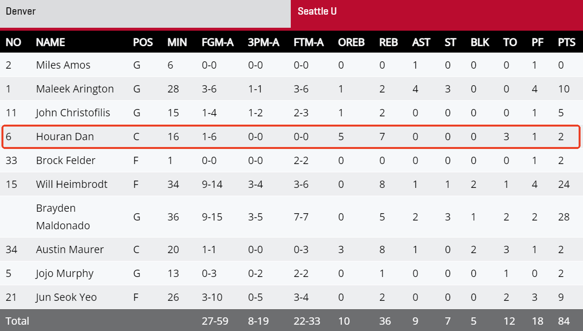 虎扑11月04日讯NCAA常规赛:西雅图大学84-73丹佛大学。