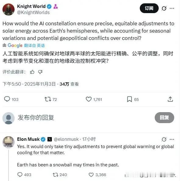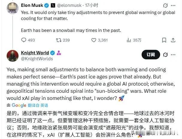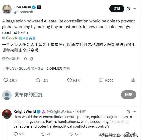胆大包天? 马斯克居然说一个大型太阳能人工智能卫星星座,可以通过对到达地球的太阳能量,进行微小调整,来阻止全球变暖。 难道马斯克要把全球变暖这个问题一下子给解决了?而且用的还是人工智能。这得用多少芯片?🉐发射多少卫星?用多少美元? 我在想,马斯克是不是没钱了,想让美国资本来投资他这个卫星星链计划?真是个奇才!想想人工智能都有点可怕了,不是吗?