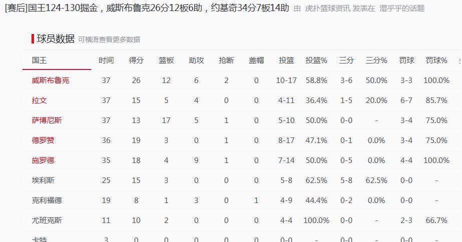 天呐? 你敢信吗? 这是威少吗? 我一度怀疑,我看错数据了。 那个威少回来了,国王打掘金,威少战旧主,威少!26分12板6助,约基奇也才34分7板14助! 最终,国王124-130掘金,6分惜败。 要知道,威少这个曾经的三双王,MVP,在新赛季,开始之前一周,还没找到工作。 全世界都等着看威少的笑话,想让他去海外打球。 如今,威少迎来了一个华丽的转身,他证明了自己油箱还有油。 今晚,威少的表现,堪称炸裂。 就他这种水准,任何争夺冠军的队伍,给他一份底薪,去试一下,这是一笔,划算的投资。 可惜了,便宜国王了。