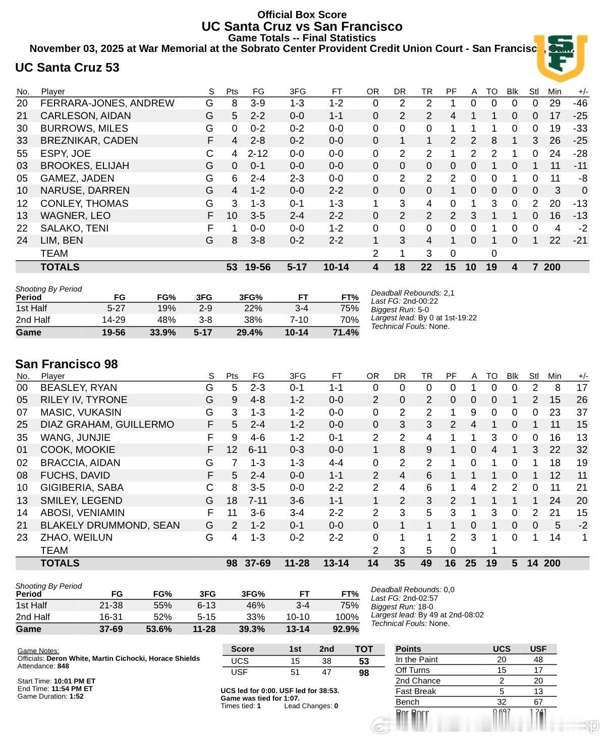 旧金山大学98比53轻取D3加州大学圣克鲁兹分校,王俊杰出场16分钟得到9分4板1助,赵维伦出场14分钟得到4分1板3助王俊杰赵维伦ncaa中国球员NCAA[超话]中国男篮[超话]