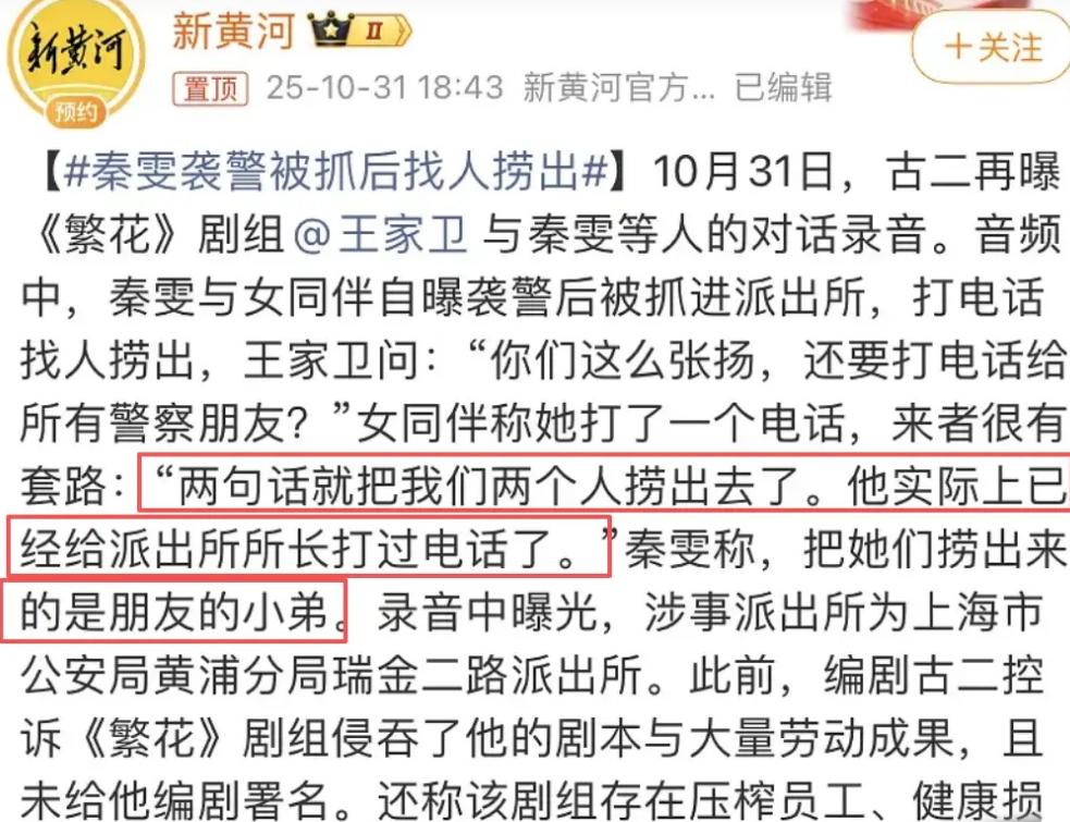 古二做了电视剧《繁花》的编剧工作,但被定性”前期资料收集小组成员“,最后在片尾署名”前期责任编辑",无怪乎古二怒从心中起,不想再隐忍。 《繁花》剧组和秦雯都没想到古二手里有多少牌,匆忙在9月23日发布《声明》。当10月底古二再次发布录音文件,不仅打脸《繁花》剧组,而且秦雯的天塌下来了。 最严重的,莫过于秦雯吹嘘袭警捞人的桥段。在法治完善的上海,出现这种漠视法律法规,通过人脉走后台操作,无异于把上海法制团队架在火上烤。警察被打、秦雯老公王光利一个电话、搞定放人、上海市三八红旗手、最佳编剧奖、普陀区政协委员....... 前有那英在微博炫耀“警车开道带着我那笨助理飞奔而去”取演出服;10年后又有秦雯污蔑警察傻、吹嘘丈夫关系硬能捞人。这些娱乐圈的名人属于赤裸裸的资本特权炫耀,心中没有一点对法律法规的尊重, 感谢古二,虽然偷录行为是不地道,但能让更多吃瓜群众知道这么多的黑幕,王家卫可以拍一部《繁花外传》,肯定很精彩啦。 任何人都不能放纵自己的行为,不能相信任何朋友,否则就会像毕福剑、王家卫、秦雯这样塌方的软成泥,要被时代抛弃,被观众唾弃。王家卫秦雯王家卫 古二