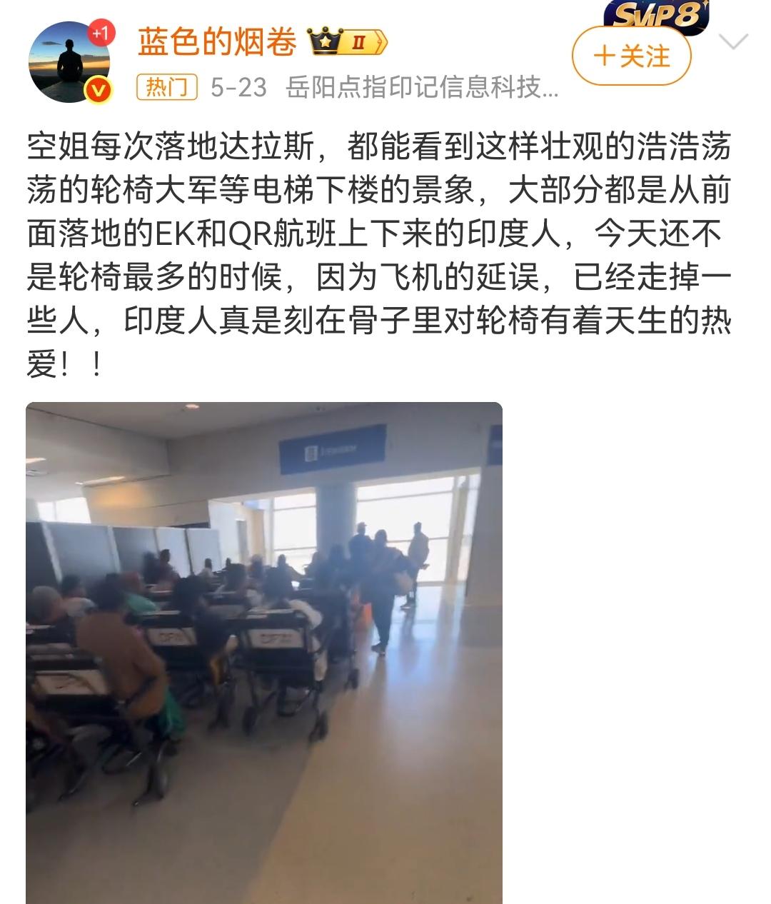 印度人的轮椅戏法。 (如图所示)自从各国航空公司为行动不便的人提供轮椅服务,被印度人知道后,印度人本着有便宜就赚的精神,无论男、女、老纷纷享受起机场轮椅服务,乌泱乌泱的印度轮椅大军,成为各国机场最靓丽的风景之一。