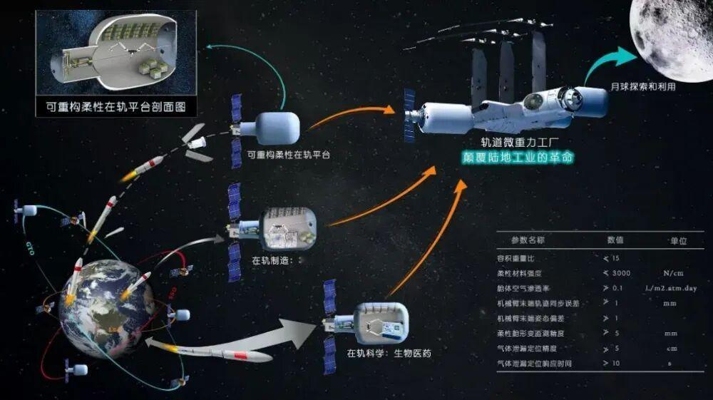 重构柔性在轨制造平台,像一个拥有“钢铁骨架”和“高科技纤维皮肤”的智能变形体。创新性地采用超柔性复合材料,发射时紧密折叠,体积小巧;入轨后充气展开,形成一个庞大、稳定的工作空间。这种设计突破了传统刚性结构的局限,易于模块化扩展与功能重构,是未来开展大规模太空生物制药、新型材料制备、在轨3D打印的理想平台,为实现“天造天用”的太空制造愿景提供了全新的技术路径