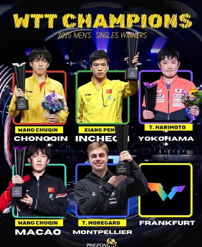 王楚钦领跑2025冠军赛男单冠军2025WTT冠军赛已落幕五站,王楚钦获得两站冠军: