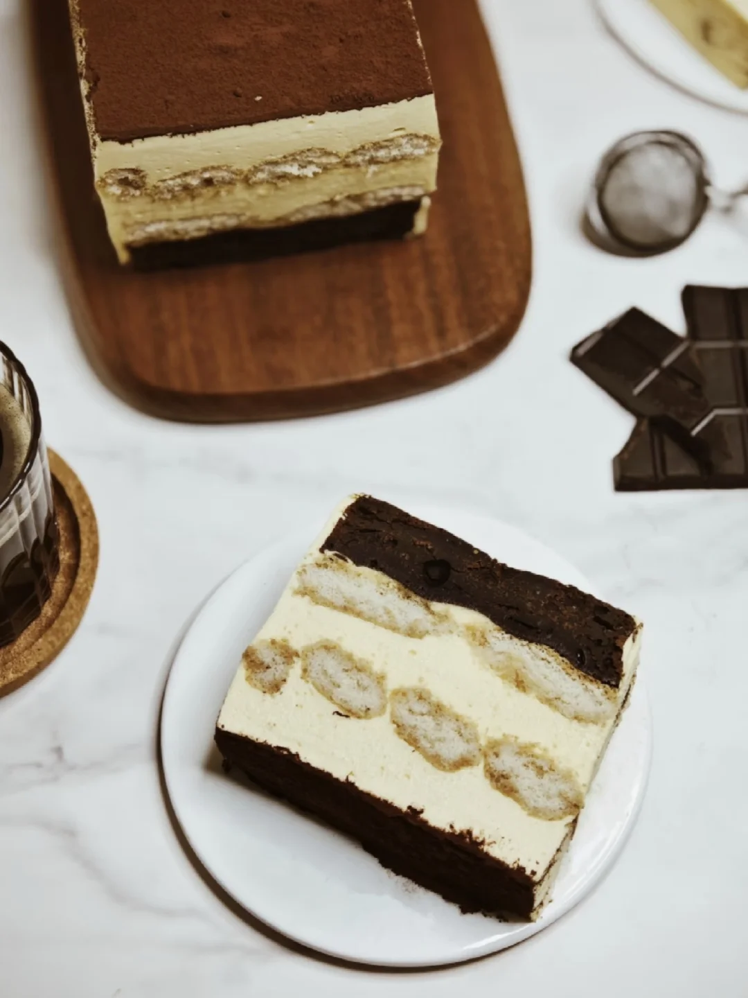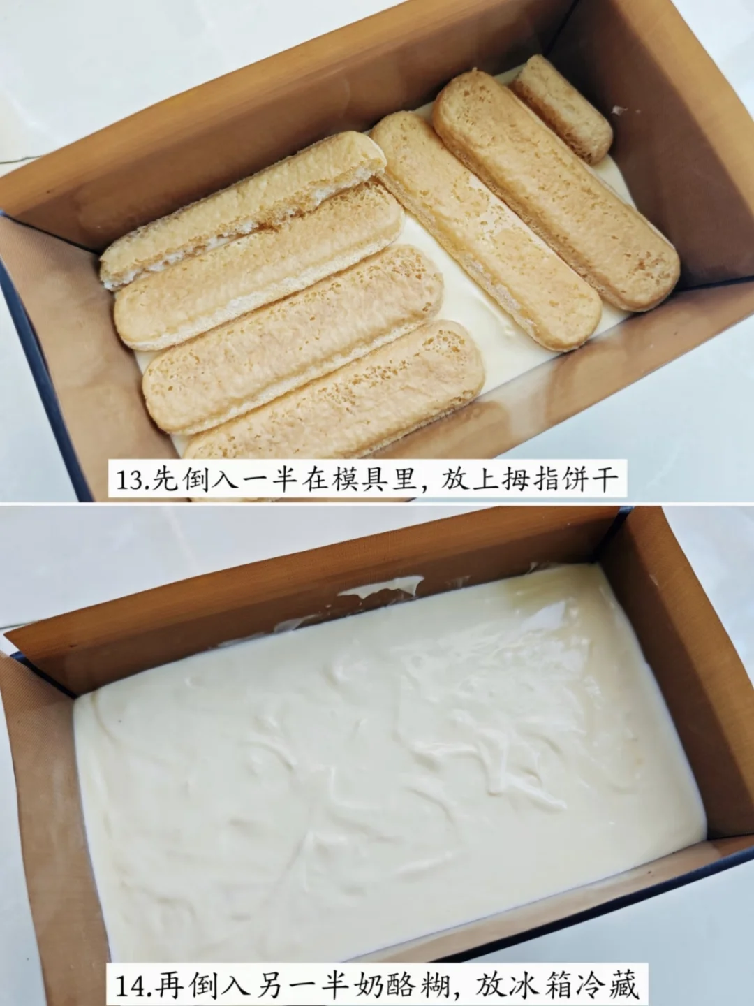 既想吃巧克力浓郁,松软的布朗尼蛋糕,又想吃奶香十足,绵密口感的提拉米苏怎么办⁉️当然是把它俩组合在一起了‼️真不是我吹,看看这个层次,看看这个奶酪糊和手指饼干,一口下去,3重口感 · 👩🏻‍🍳【配方:】 🍫布朗尼蛋糕层: 黑巧克力90g|黄油50g|全蛋液120g|细砂糖50g|低筋面粉45g |可可粉5g 🍫提拉米苏蛋糕层: 马斯卡彭芝士250g|淡奶油200g|细砂糖20g+30g|无菌蛋黄2个|热牛奶50g|吉利丁片10g|手指饼干|浓缩咖啡液 · 👩🏻‍🍳【制作步骤:】 1️⃣隔热水融化黄油🧈和巧克力🍫,常温全蛋液与细砂糖一起打发至蓬松发白,倒入融化的巧克力黄油,混合均匀 2️⃣依次倒入可可粉和低筋面粉,翻拌均匀,倒入模具里 3️⃣放入预热好的烤箱180度30分钟,晾凉备用 4⃣️制作提拉米苏的蛋黄🥚和30g细砂糖隔热水打发至颜色变浅、体积膨胀、质地浓稠 5⃣️将马斯卡彭奶酪室温软化后,与蛋黄糖霜搅拌均匀; 淡奶油➕20g细砂糖打发浓稠,倒入奶酪糊里,翻拌均匀; 热牛奶与冷水泡软的吉利丁片搅拌融化,倒入奶油奶酪糊里,搅拌均匀。 6⃣️手指饼干两面蘸取浓缩咖啡液,整齐码放在布朗尼蛋糕上 7⃣️均匀铺上一半的奶酪糊,再码放一层手指饼干,再倒入另一半的奶酪糊。放入冰箱冷藏2个小时以上。 8⃣️取出后,撒上满满一层可可粉