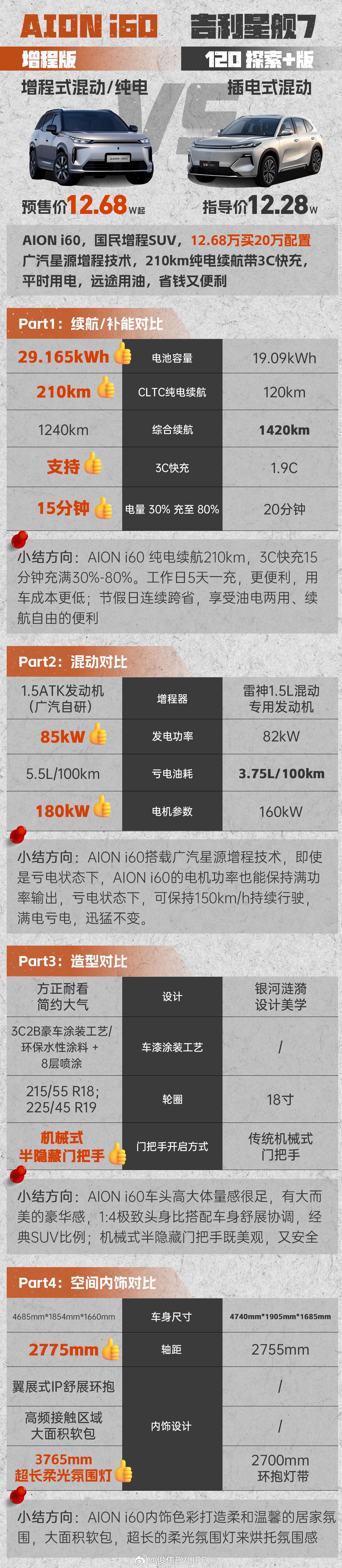 AION i60 增程版和行业卖的不错的吉利星舰7 EM-i来做个对比,预售价仅4000元差价的情况下,产品力竟如此出色!