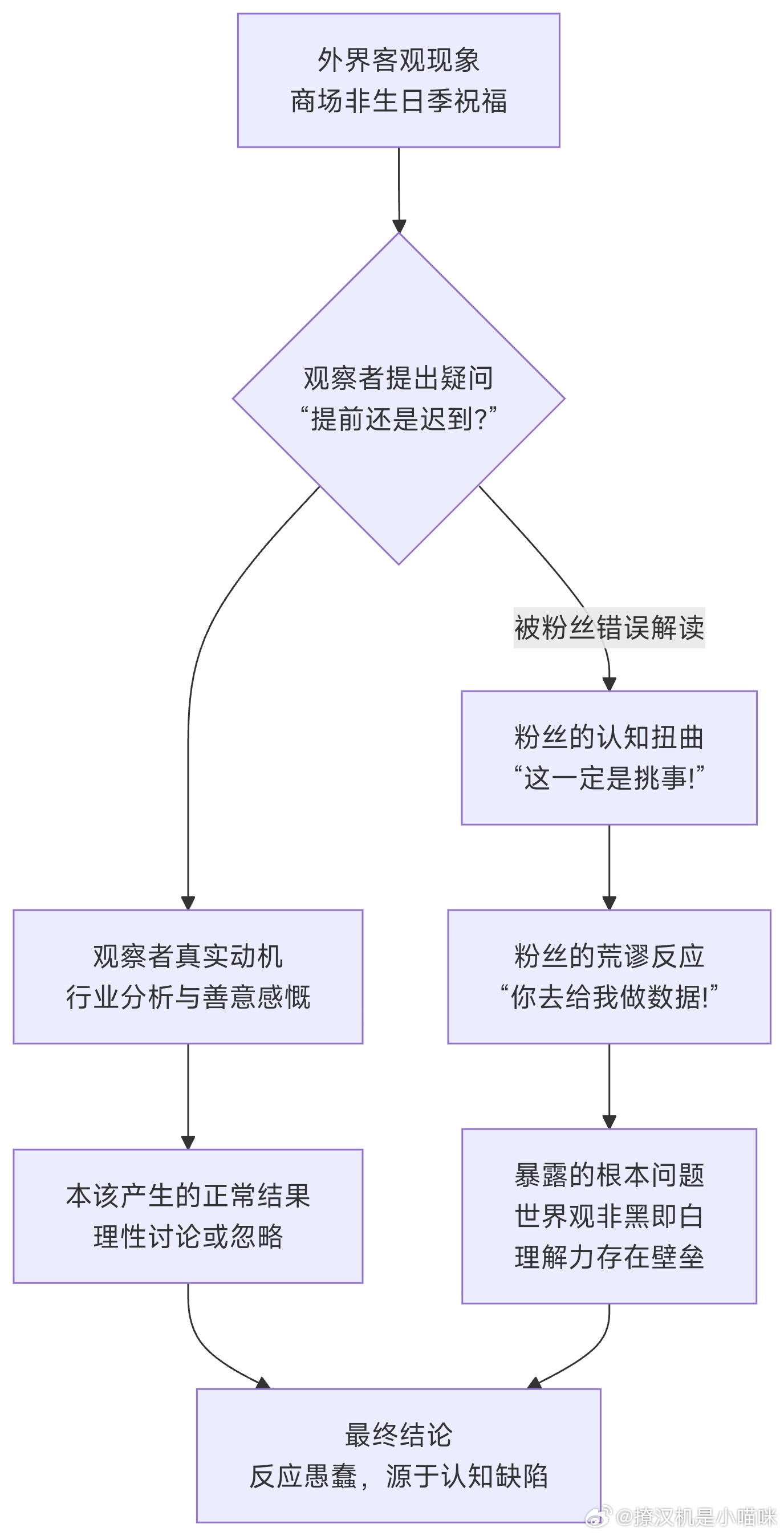 格局打开点。世界很大,不是所有账号都是粉籍号,也不是所有发言都需要用粉圈逻辑来审判。此案例完美展现了“媒体思维”与“粉圈思维”的壁垒。前者致力于解读现象,后者只容得下绝对服从。建议某些人适当拓宽认知边界,否则真的很丢人
