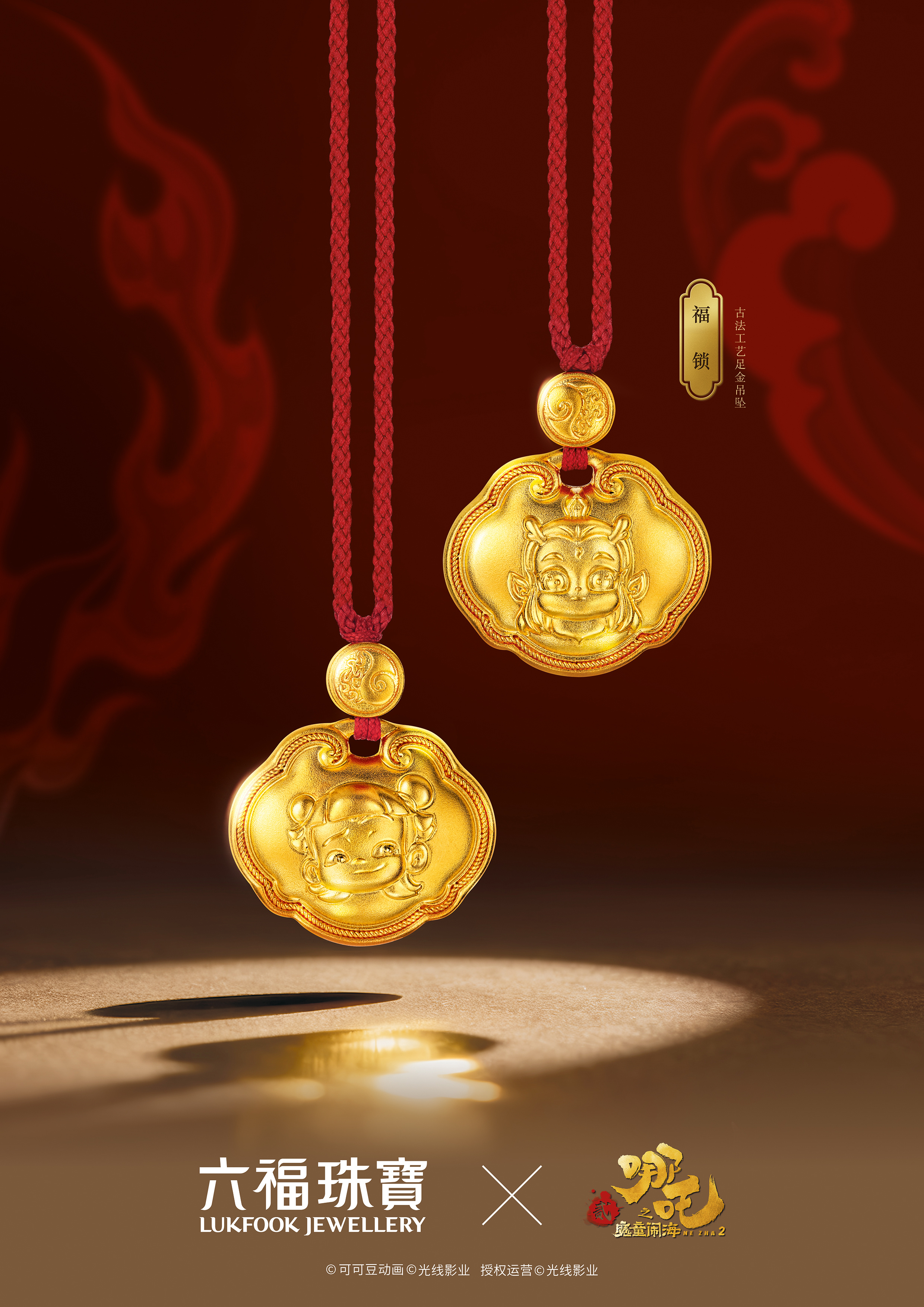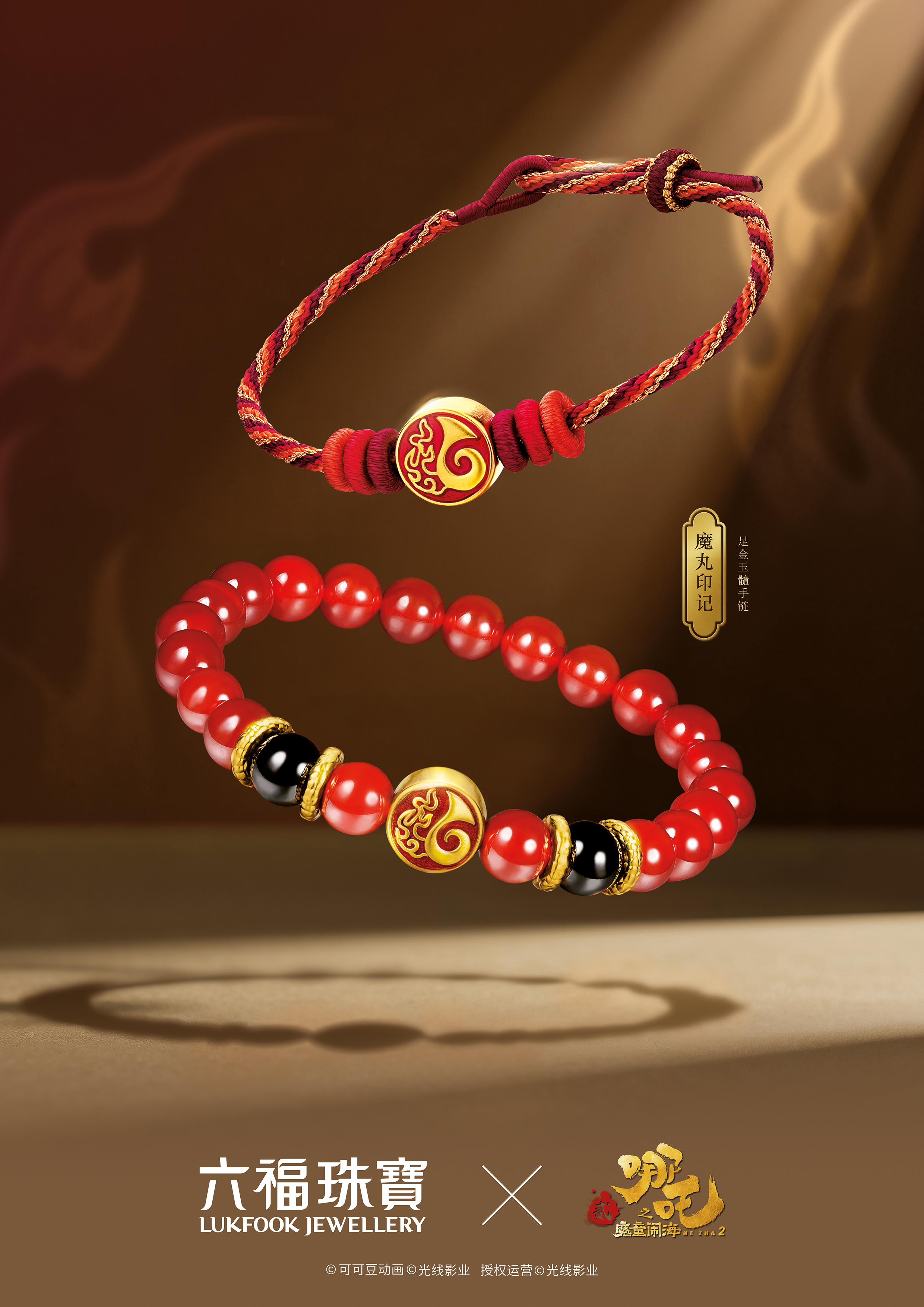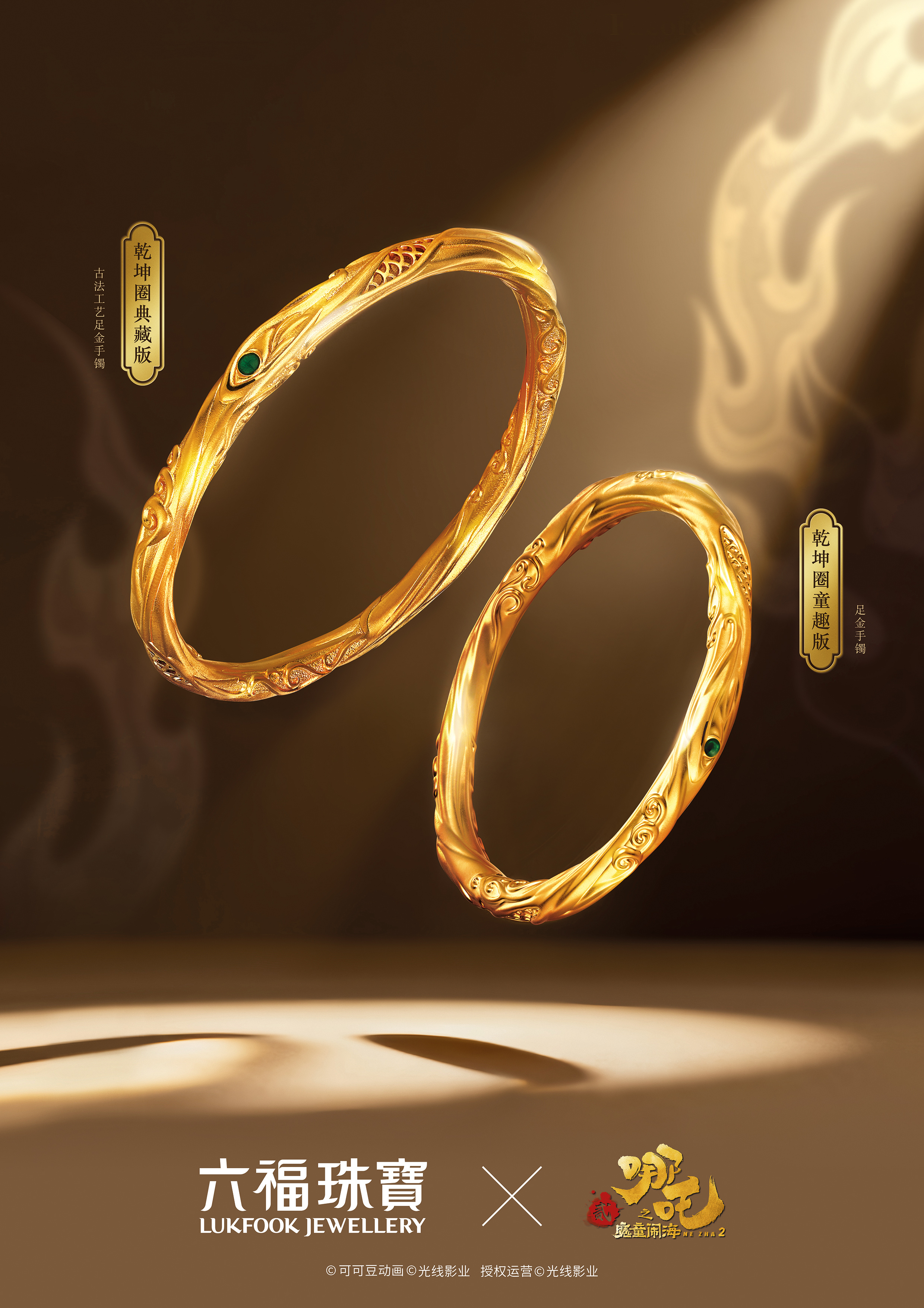 六福珠宝哪吒2联名 时隔五年,经典再续!与电影哪吒之魔童闹海 再度携手,以匠心工艺重塑传奇。本次乾坤圈工艺升级,将千年神话凝于璀璨金环之中,细节之处尽显非凡。喜欢小件金饰的还有哪吒 、敖丙 、结界兽等足金串饰手绳,精致小巧,是腕间一抹亮眼的国潮风尚,亦是陪伴你很久的”硬通货”。当传统金饰邂逅少年英雄,会碰撞出怎样的火花?敬请期待这场跨越时空的珠宝盛宴!