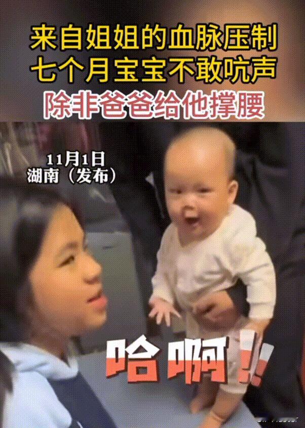 笑的肚子疼!湖南,七个月的宝宝独自和姐姐在一起的时候,特别怕姐姐甚至都不敢跟姐姐对视。但是万万没想到它虽然人小但是特别精,只要爸爸一来给他撑腰,他瞬间就大变脸,直接大声和姐姐对吼。网友:又可爱又好笑! 宝宝和姐姐在客厅吵架,虽然才七个月大厉害的不行。姐姐血脉压制的他呀,都不敢吭声,甚至不敢和姐姐对视。但是小小年纪的他就懂得了审视眼神,一度在向站在一旁看热闹的爸爸求助。 当爸爸来抱他的时候,瞬间觉得撑腰的人来了,直接冲着姐姐大吼,毫不示弱的样子。家人都觉得很搞笑,当爸爸故意把他放沙发上,看他什么样的时候,他瞬间就怂了。 简直就是小孩的脸六月的天,爸爸一抱就凶,一放就怂。姐姐的血脉压制让我好像看到了,长姐如母在这一刻具象化!不过这么小小的一个人,敢于说出“不公平”,看来长大后一定也很了不得。 看来每个家庭都离不开姐姐的血脉压制,因为这个家没有姐姐的存在的话绝对会翻天。并且姐姐管弟弟的时候,家长一般都不会插嘴。只会在一旁看热闹不嫌事大,或者是怕惹祸上身。不过这画面真的是既可爱又想笑还好玩。 不过也就是自己的弟弟妹妹也只有自己能欺负,别看压制多厉害就爱的有多深。 对于这件事情,大家有什么看法? 信息来源:大道新闻