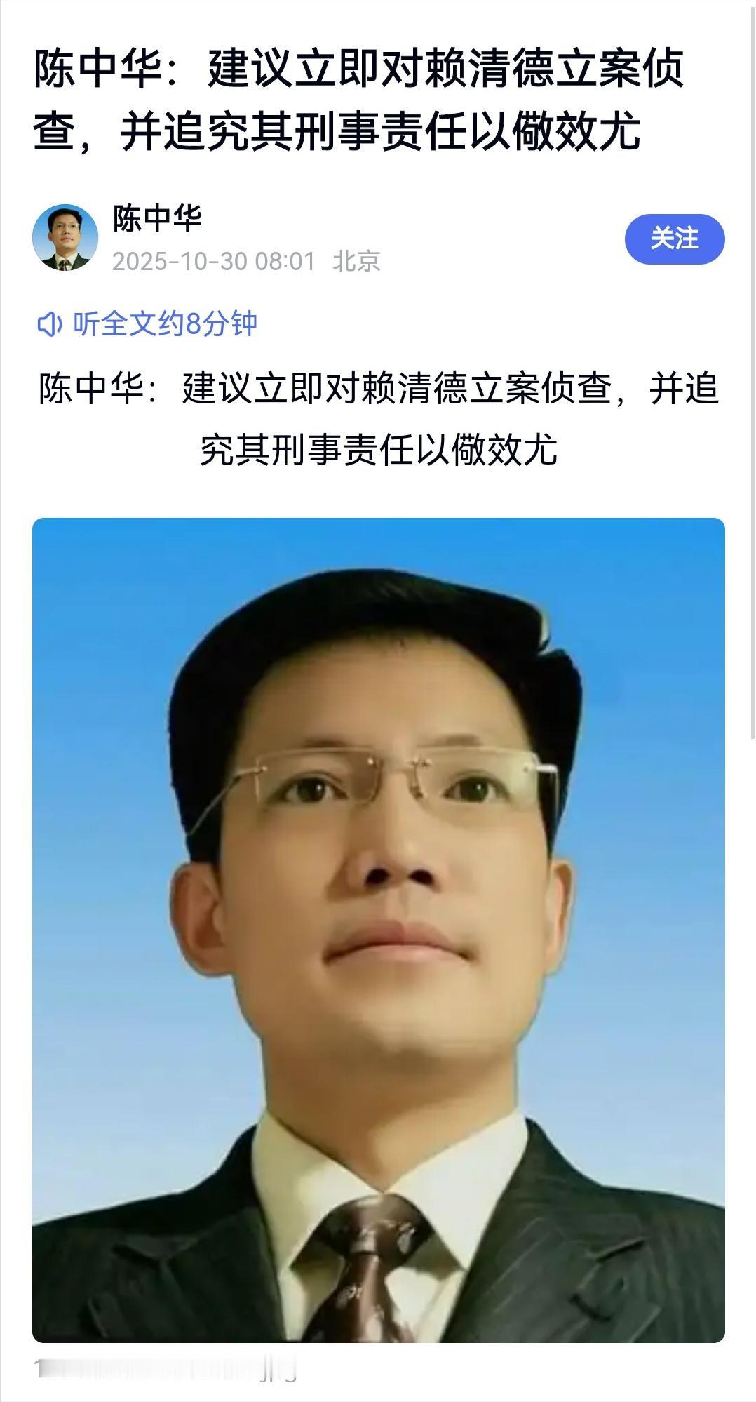 总算有人提出了这个建议。北京中公法律咨询中心主任陈中华建议立即对赖清德立案侦查,并追究其刑事责任。 陈中华认为赖清德从事“台独”分裂行径事实确凿,自我供认不讳,因此他建议大陆公安机关对赖清德进行立案侦查,查清其犯罪事实之后,追究他的刑事责任,严惩不贷。 仅仅对沈伯洋立案侦查是不够的。应该把台湾的所有台独分子从大到小依次排开整体打包一并立案侦查,证据确凿,立刻下发逮捕令,并通过国际刑警组织向全球发出红色通缉令。这样做从法理上说是没有问题的,而且让他们无处可逃,会对“台独”分子产生极大的震慑作用。 赖清德背叛民族,分裂国家,其罪行证据确凿,有目共睹,无需侦查,可直接立案,缺席审判并进行严惩。只有这样才能将“台独”分子的嚣张气焰打下去,才能进一步推进两岸的和平统一进程。 对“台独”分子绝不能手软,不管大小,只要露头就必须严打。通过缺席判决这样的方式,先给他们定罪量刑,一旦将他们抓获归案,就可以让这些“台独”分子们付出应有的代价。