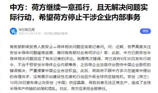 荷兰有麻烦了!这一次,我们商务部把话说的非常重!11月4日,围绕安世半导体问题,我们商务部出来表态了。中国商务部对于该纠纷荷兰方面的表现的定性是,荷兰继续一意孤行,且无解决问题实际行动。荷兰政府不顾中国多次在磋商中提出的合理诉求,没有展示出建设性态度和行动且升级全球供应链危机。   很显然,这说明荷兰在这事儿上根本没拿出解决问题的诚意,做的事儿确实太过分。   要说清楚这事儿,得先明白安世半导体到底是谁的企业。很多人以为安世挂着荷兰的牌子就是荷兰的,其实不然,它早被中国的闻泰科技控股了,实打实是中国企业说了算的公司。   这公司可不是小作坊,全球一半的汽车小信号二极管都出自它家,德国大众、宝马,美国通用这些车企,都得靠它的零件开工。   荷兰政府偏要在这上面动歪心思,9月30日,荷兰政府先出台了一道行政令,直接冻结了安世全球30个主体的资产和人事变动,说是为了“国家安全”。   更过分的是,荷兰当地法院还跟着添乱,直接裁决剥夺了中国企业持有的安世股权,甚至把闻泰科技董事长在安世的董事职务都给停了,另派了个有“决定权”的独立董事过来。   这操作说白了就是干涉企业内部事务,哪有东道主这么对待外资控股企业的?中方肯定不能坐视不管。之后的日子里,中方跟荷兰进行了好几次磋商,每次都提了合理诉求,可荷兰那边根本不当回事,一点建设性行动都没有。   安世荷兰那边更绝,10月26日直接宣布停止给中国东莞的封装测试工厂供应晶圆。要知道,东莞这个基地承担了安世七成的产能,没了晶圆,生产线随时可能停摆。这一下,全球半导体供应链立马就乱了套,不少车企都开始慌了,库存芯片撑不了多久,生产线随时可能停工。   这事背后其实另有推手,谁都能猜到是美国在捣鬼。美国看安世被中国企业控股,技术又关键,就怕自己卡不住中国的脖子。它先把闻泰科技拉进“黑名单”,不让美国企业供货,接着又改规则,说中国控股超五成的企业都算“黑名单”成员,硬生生把安世拽了进去。   美国还撺掇荷兰,说只要换掉中国管理层,就给安世开“后门”。荷兰被这么一忽悠,就真当了出头鸟,可它没算明白这笔账。安世是全球汽车产业链的关键一环,它一停摆,欧洲和美国的车企先受不了。德国大众已经急得跳脚,美国汽车供应商协会也警告说库存撑不了两个月,这都是荷兰的任性操作捅出来的篓子。   中方一直抱着解决问题的态度。11月1日,中方特意宣布对符合条件的出口予以豁免,就是想帮安世中国恢复供货,稳住全球供应链。可荷兰根本不接茬,依旧我行我素。   现在全球业界都看着荷兰呢。安世中国倒是有预案,库存还能撑到年底,也在找新的晶圆来源,但这毕竟不是长久之计。荷兰要是真把事情闹到安世中国停产的地步,不仅要赔经济损失,更得背上破坏全球供应链的骂名。   中荷经贸关系本来好好的,荷兰偏要跟着美国趟这浑水。它忘了中国是全球最大的半导体市场之一,之前阿斯麦的DUV光刻机一半销量都来自中国。这么折腾下去,受损的可不只是安世一家,荷兰自己的半导体产业也得受连累。   荷兰现在是骑虎难下了。听美国的继续闹,自己得承担所有后果;回头跟中方好好谈,又怕得罪美国。但中方的态度已经摆得明明白白,想靠拖延蒙混过关根本没用。再这么一意孤行下去,荷兰的麻烦只会越来越大。   来源:华尔街见闻 【中方:荷方继续一意孤行,且无解决问题实际行动,希望荷方停止干涉企业内部事务】