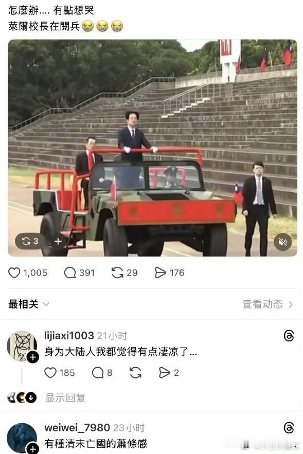 太拉风了[捂脸]! 这拖拉机是在拉着赖清德游街吗?钱呢?都被美帝国主义坑走了吗?真是丢人现眼,你看那几根头毛被炸的,还不找个地洞钻进去算了!