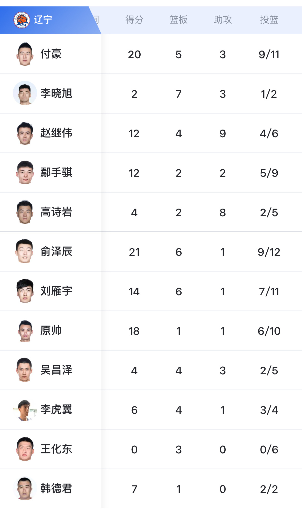 大牙全队最高21分6篮板,付豪20分5篮板3助攻,原帅18分,刘雁宇14分6篮板,继伟12分9助攻4篮板,手12分,大韩7分, 虎子6分4篮板,高诗岩4分8助攻,大C 4分4篮板,二哥2分7篮板3助攻,王化东3篮板。