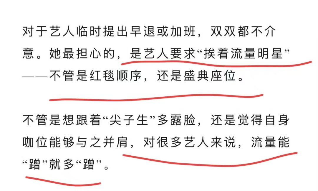 曝有明星在红毯上假装摔倒曝艺人要求红毯座位挨着流量明星艺人们也是挺逗的,赶上宫斗了。曝艺人会因盛典上不了热搜发脾气