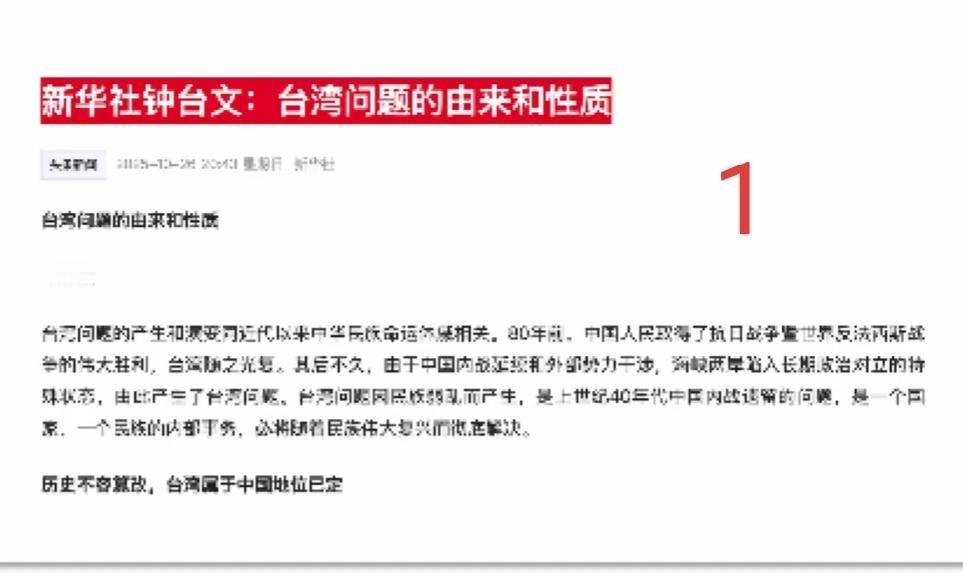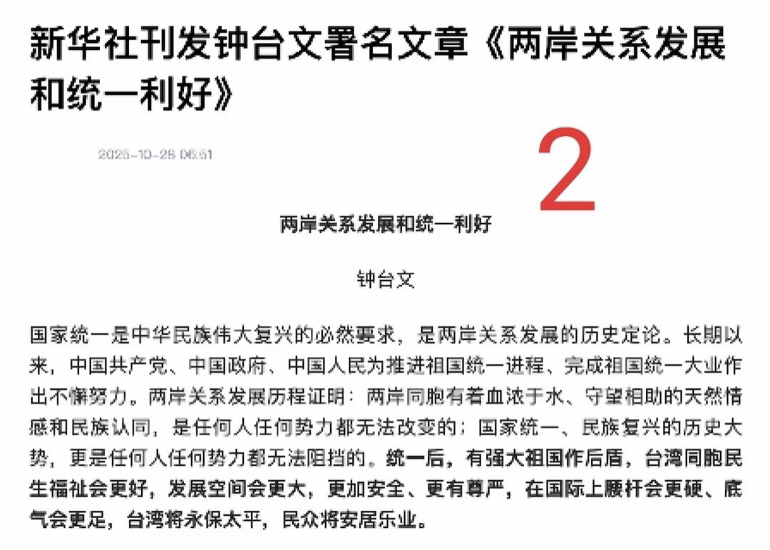 新华社连发三篇长文论″湾湾″,透露回归到了一个非常时期! 2025年10月,发生了很多大事喜事难事,但最让我关注的还是新华社连发三篇长文讲述弯弯的有关问题。这波操作太猛啦,连续三篇,而且是新华社的署名文章,这种高度以往很少出现,说明"弯弯″的问题已经到了一个非常时期。 先看10月26日的第一篇,直接定调说台湾问题是中国内战遗留的内部事务,划清界限,重点是告诉大家台湾是咱中国的,谁也别想插手,更是对是外部势力和台独分子有力警告。 第二篇《两岸关系发展 和统一利好》,直接给出了解决问题的方案,毕竟大家都想过上好日子,发展、稳定、繁荣才是王道。如果有人想分裂,想谋独,那得问问我们人民答应不答应,解放军答应不答应,我们还有更多的保留手段。 第三篇更是霸气放话“祖国必然统一,势不可挡”。而且从经济、法律、外交、军事亮了底牌。经济上,台湾经济离不开咱大祖国,“凤梨滞销”就是例子;法律上,敢搞“台独”就依法通缉;军事上,围岛演训常态化,台湾海峡随便走;外交上,183个国家和咱建交,“断交”的越来越多。 如果这三篇文章你还没看出一些门道,那还有《沉默的荣耀》开播,吉林一号曝光台湾图像细节,国家安全部曝光台湾网军,央视发抢滩视频,重庆公安对沈伯洋展开刑事侦查等等,这一套组合拳下来,湾湾回归那就是板上钉钉,谁也拦不住,就等着迎接大团圆啦!
