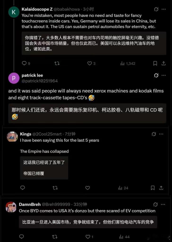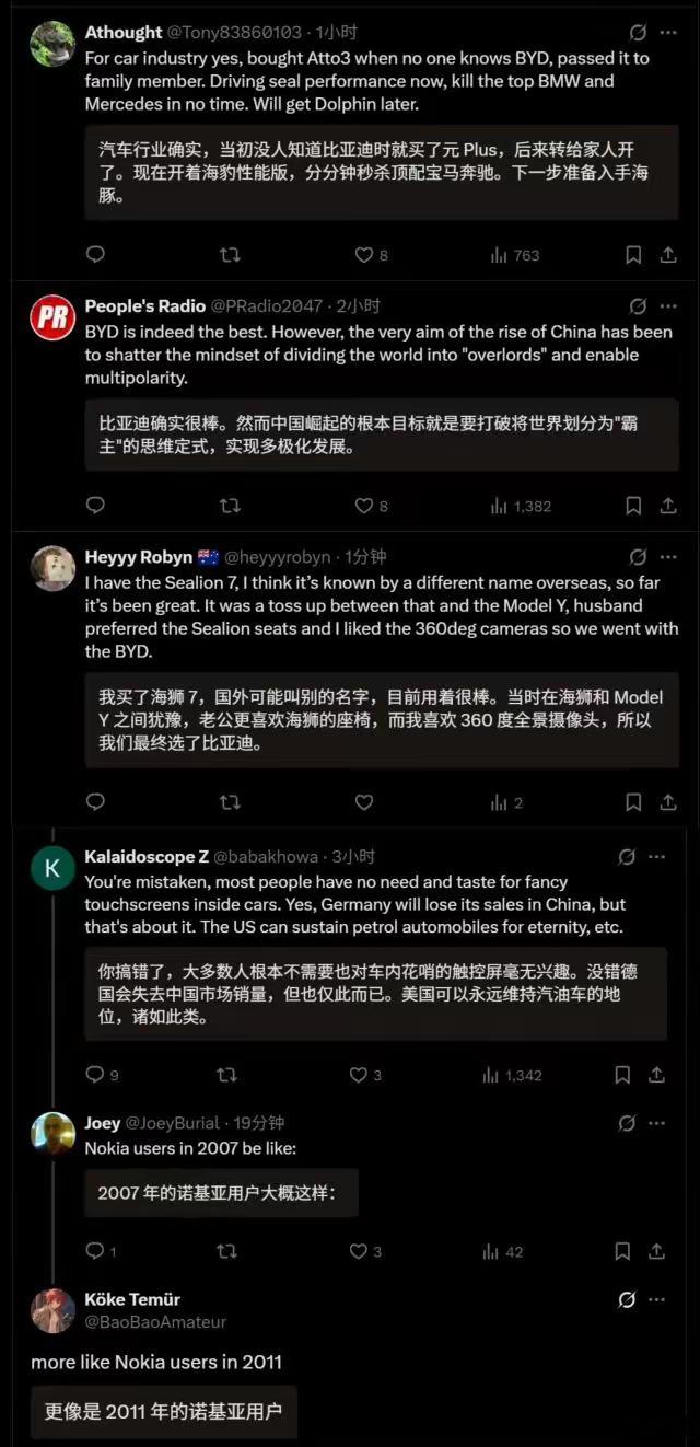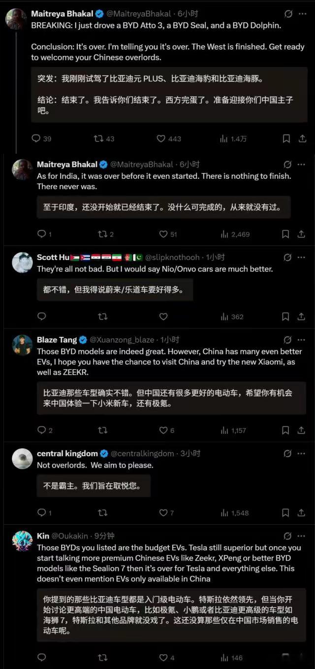印度一个记者说:他试驾了比亚迪元PLUS、海豹和海豚。得出来的结论是西方完蛋了。至于印度,还没开始就已经结束了。感觉主要还是功能又新又实用,在国外也是豪车的代表。
